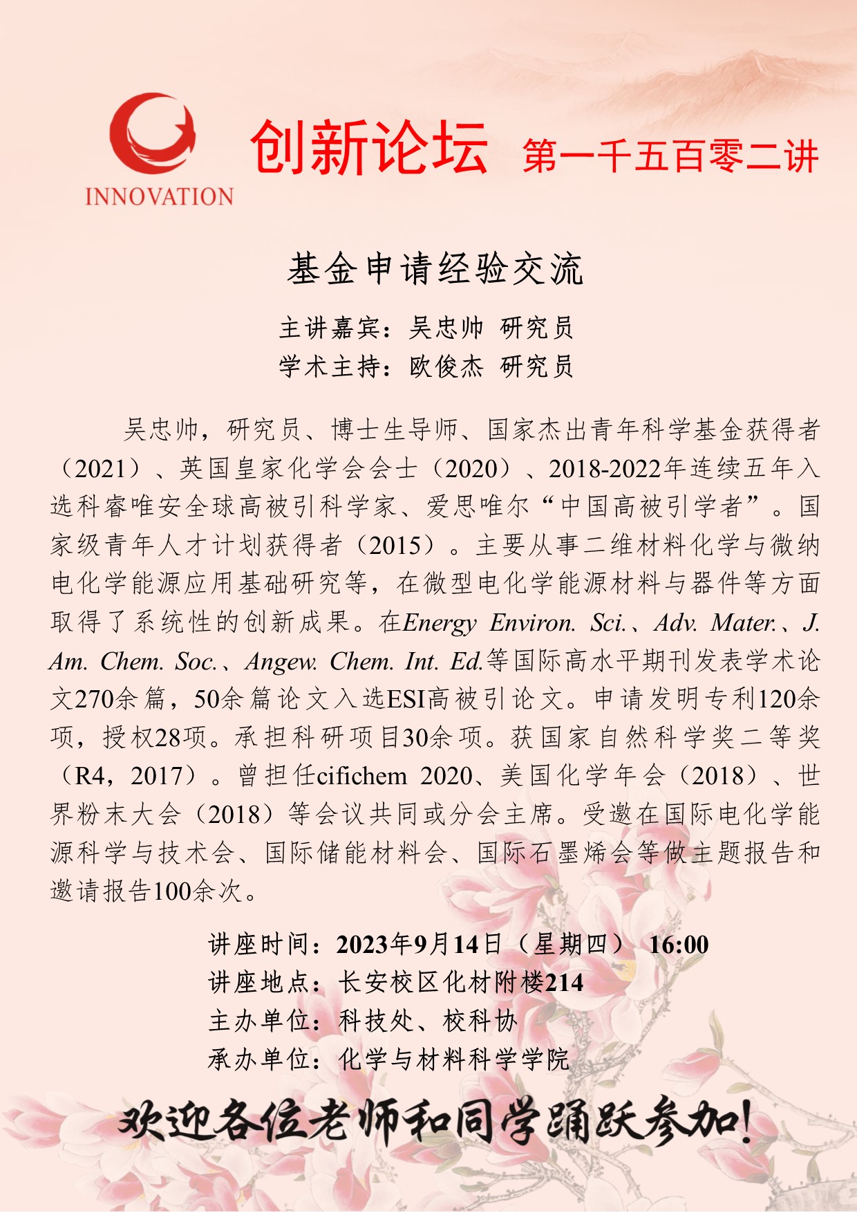 吴忠帅 研究员 古天乐代言太阳集团城网址创新论坛第一千五百零二讲: 基金申请经验交流 讲座时间 2023年9月14日(星期四) 16:00 讲座地点 长安校区化材附楼214 讲座人介绍 吴忠帅 研究员 讲座内容