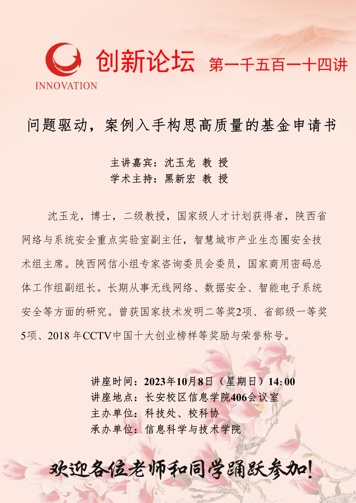 沈玉龙 教 授 古天乐代言太阳集团城网址创新论坛第一千五百一十四讲: 问题驱动,案例入手构思高质量的基金申请书 讲座时间 2023年10月8日(星期日)14:00 讲座地点 长安校区信息学院406会议室 讲座人介绍 沈玉龙 教 授 讲座内容