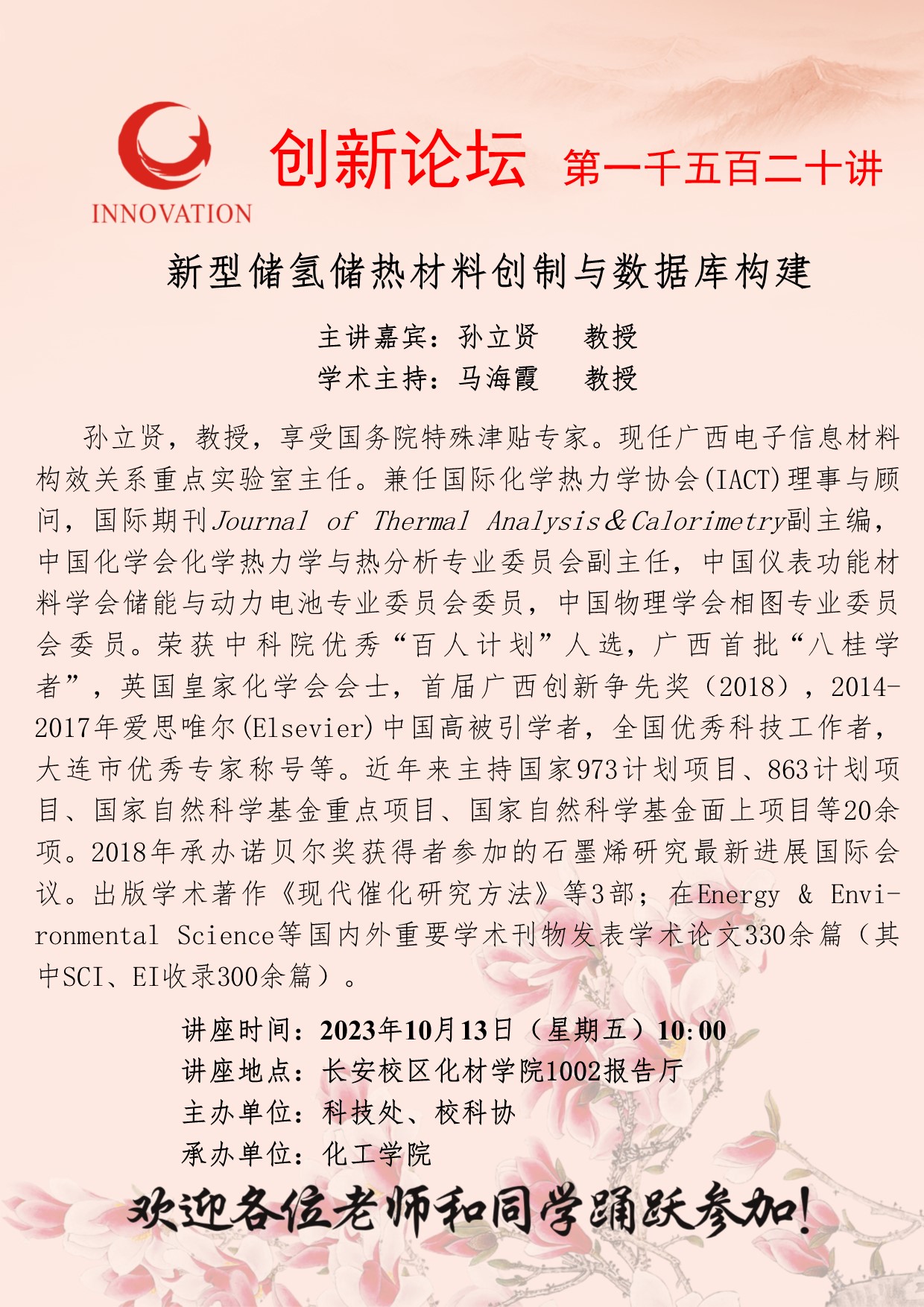 孙立贤 教授 古天乐代言太阳集团城网址创新论坛第一千五百二十讲:新型储氢储热材料创制与数据库构建 讲座时间 2023年10月13日(星期五)10:00 讲座地点 长安校区化材学院1002报告厅 讲座人介绍 孙立贤 教授 讲座内容