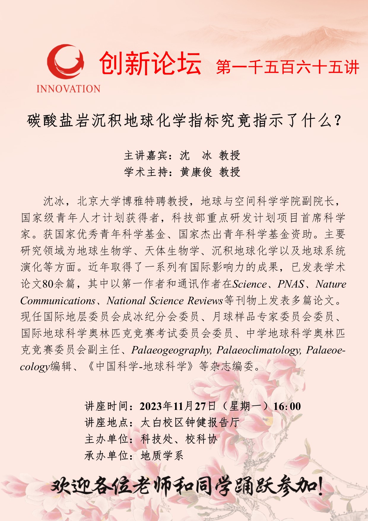 沈冰 教授 古天乐代言太阳集团城网址创新论坛第一千五百六十五讲:碳酸盐岩沉积地球化学指标究竟指示了什么? 讲座时间 2023年11月27日(星期一)16:00 讲座地点 太白校区钟健报告厅 讲座人介绍 沈冰 教授 讲座内容