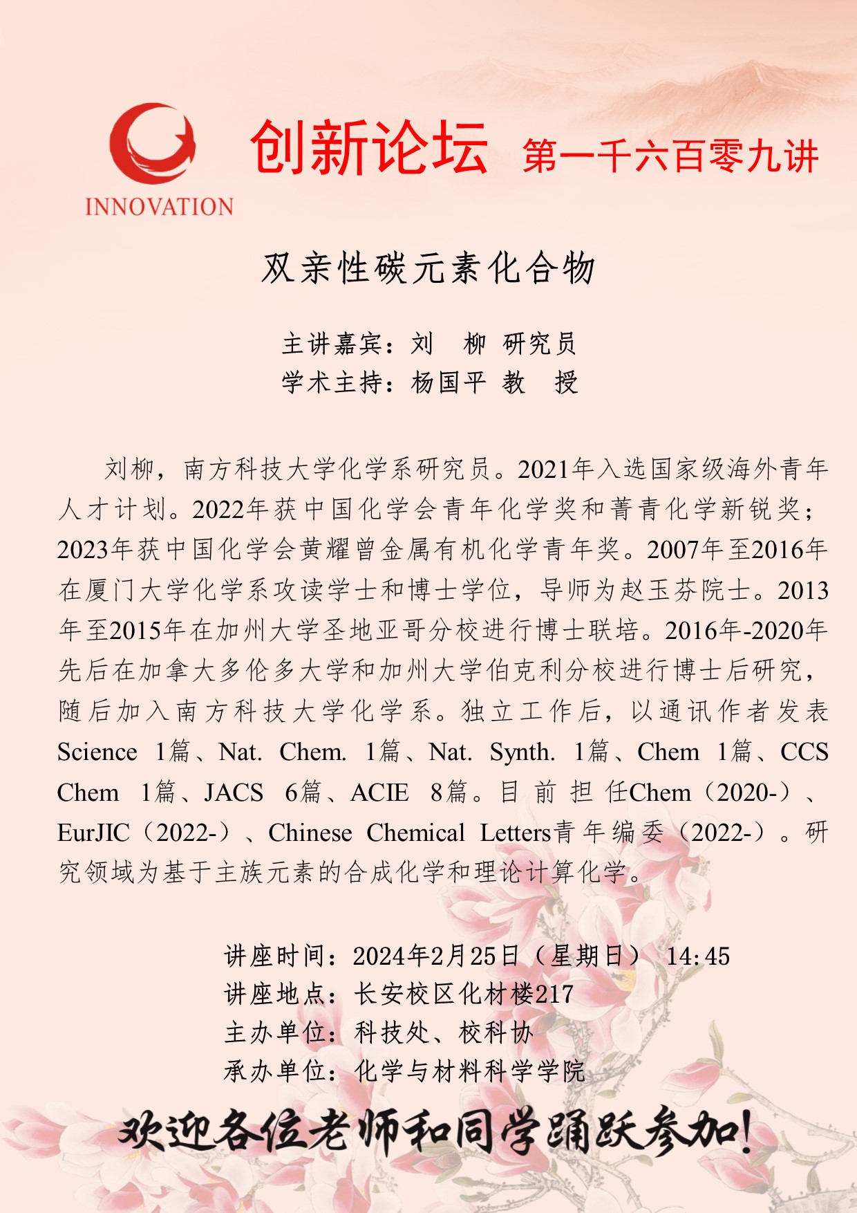 刘柳 研究员 古天乐代言太阳集团城网址创新论坛第一千六百零九讲:双亲性碳元素化合物 讲座时间 2024年2月25日(星期日) 14:45 讲座地点 长安校区化材楼217 讲座人介绍 刘柳 研究员 讲座内容