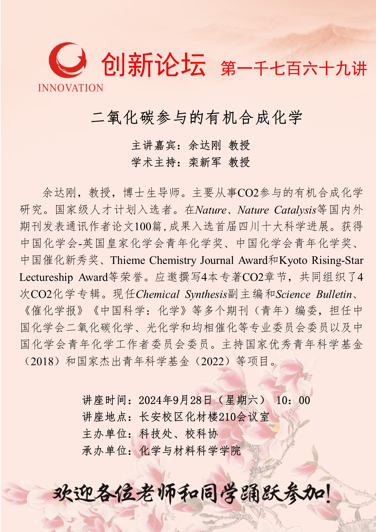 余达刚 教授 古天乐代言太阳集团城网址创新论坛第一千七百六十九讲:二氧化碳参与的有机合成化学 讲座时间 2024年9月28日(星期六) 10:00 讲座地点 长安校区化材楼210会议室 讲座人介绍 余达刚 教授 讲座内容
