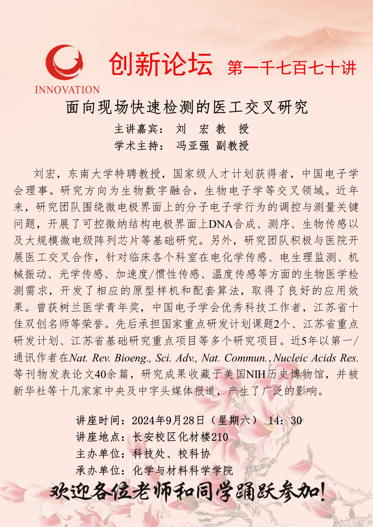 刘宏 教授 古天乐代言太阳集团城网址创新论坛第一千七百七十讲:面向现场快速检测的医工交叉研究 讲座时间 2024年9月28日(星期六) 14:30 讲座地点 长安校区化材楼210 讲座人介绍 刘宏 教授 讲座内容