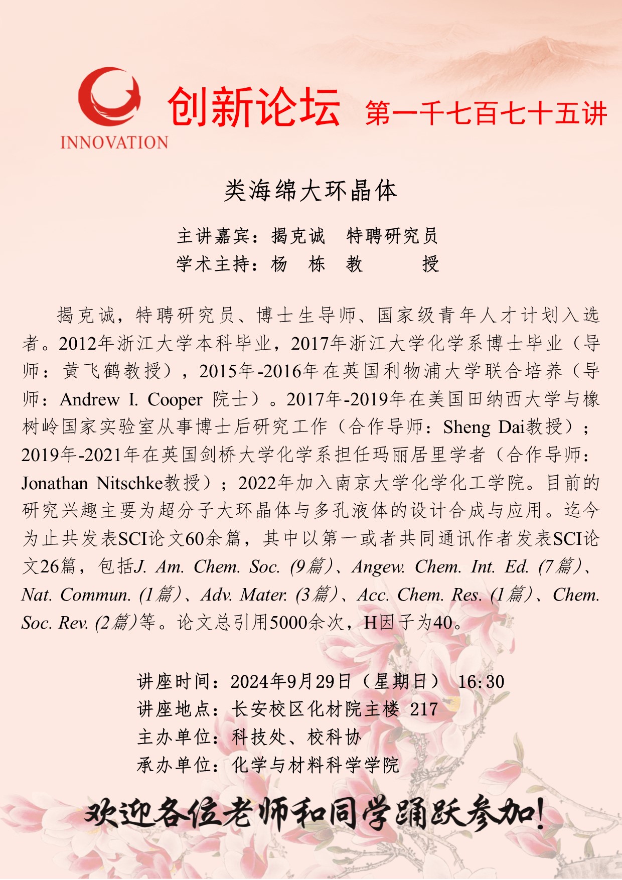 揭克诚 特聘研究员 古天乐代言太阳集团城网址创新论坛第一千七百七十五讲:类海绵大环晶体 讲座时间 2024年9月29日(星期日) 16:30 讲座地点 长安校区化材院主楼 217 讲座人介绍 揭克诚 特聘研究员 讲座内容