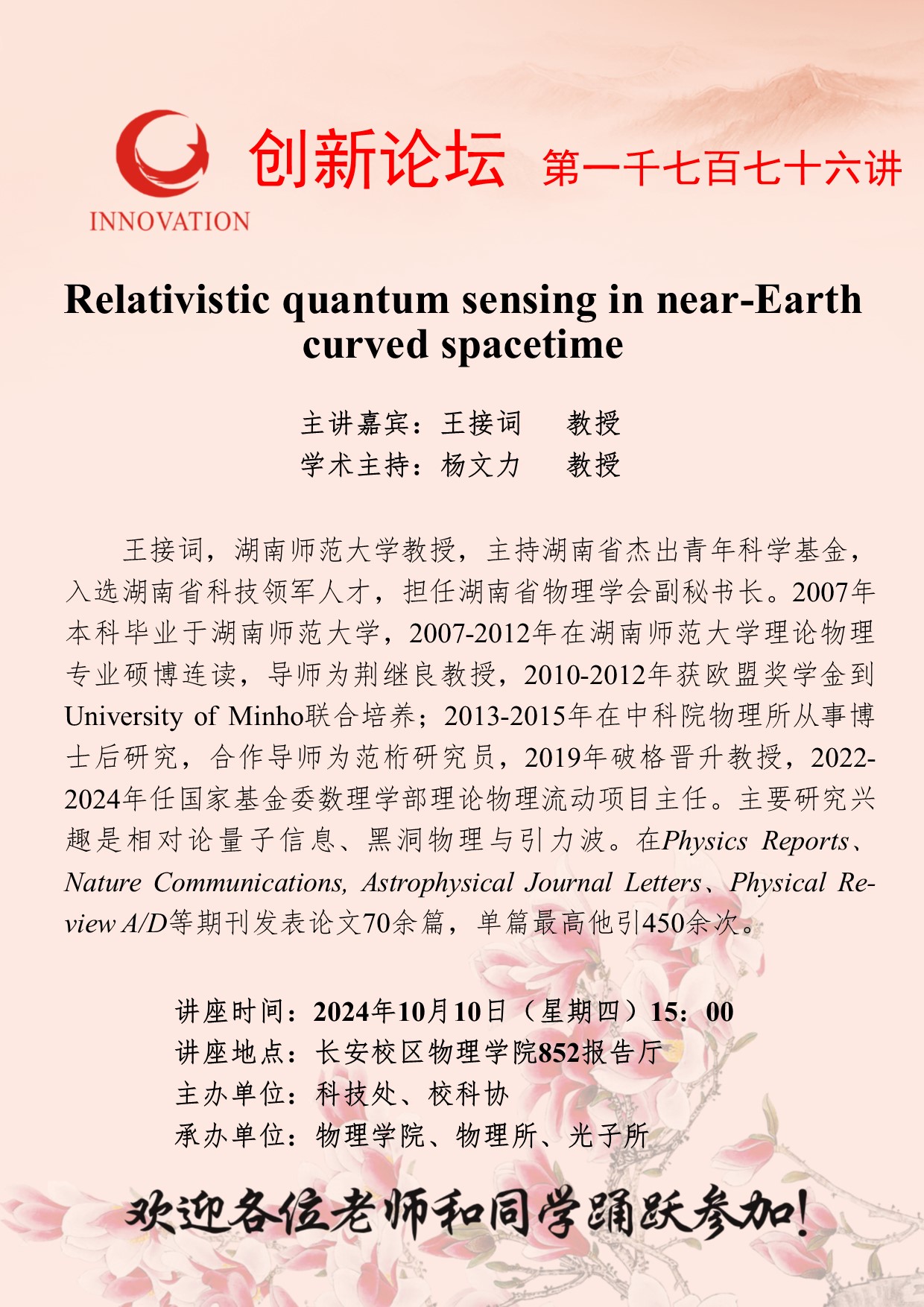 王接词 教授 古天乐代言太阳集团城网址创新论坛第一千七百七十六讲:Relativistic quantum sensing in near-Earth curved spacetime 讲座时间 2024年10月10日(星期四)15:00 讲座地点 长安校区物理学院852报告厅 讲座人介绍 王接词 教授 讲座内容