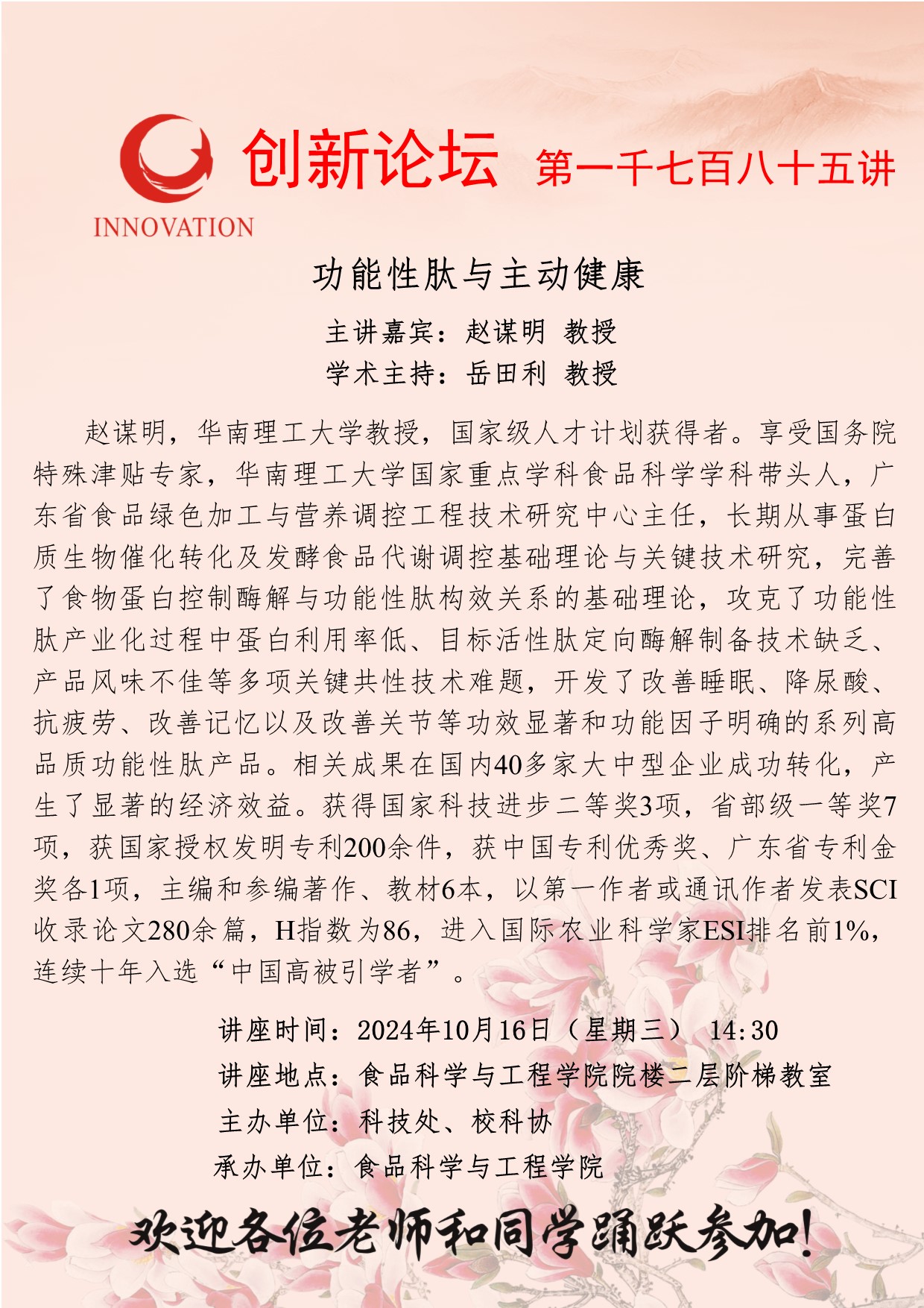 赵谋明 教授 古天乐代言太阳集团城网址创新论坛第一千七百八十五讲:功能性肽与主动健康 讲座时间 2024年10月16日(星期三) 14:30 讲座地点 食品科学与工程学院院楼二层阶梯教室 讲座人介绍 赵谋明 教授 讲座内容