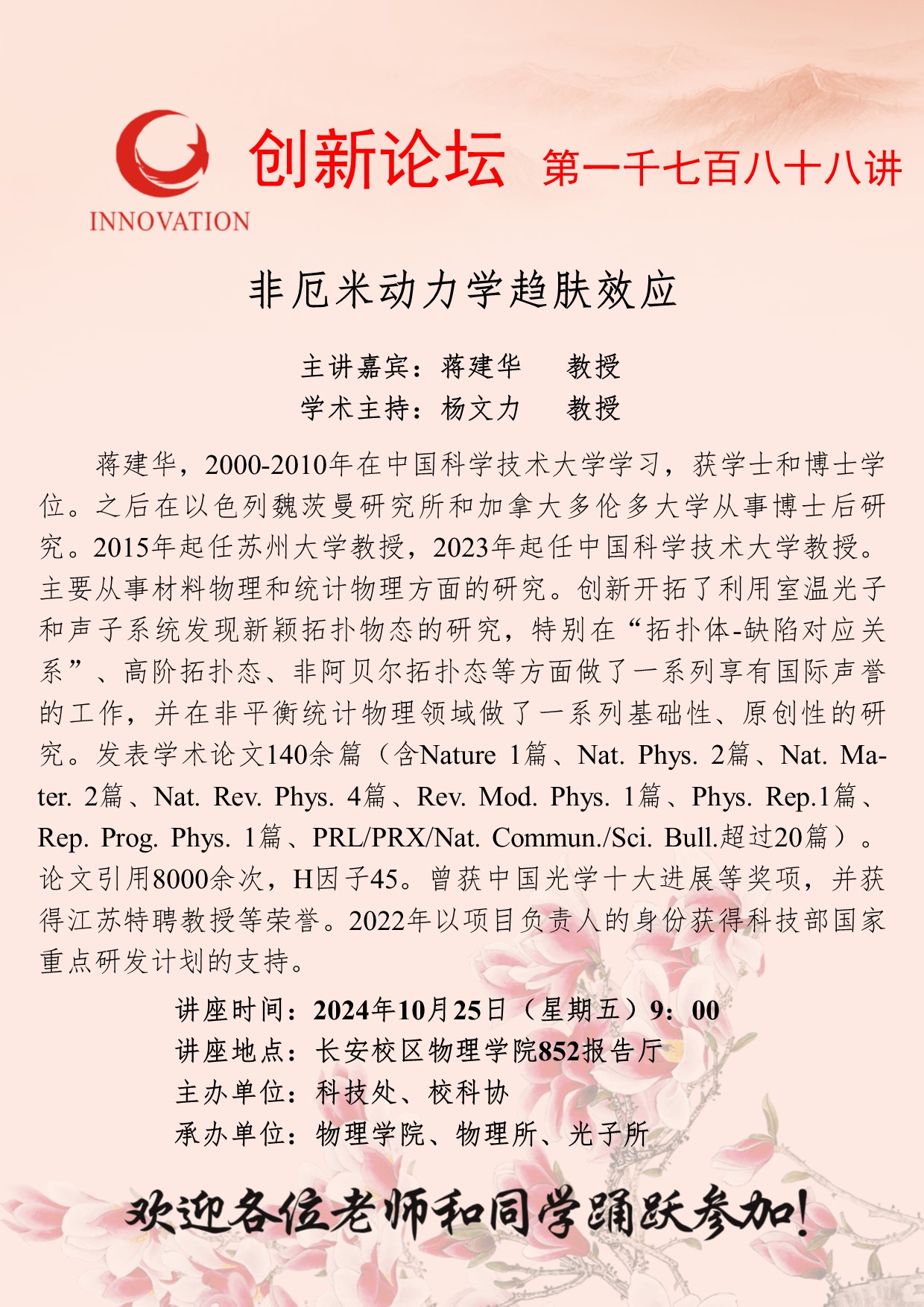 蒋建华 教授 古天乐代言太阳集团城网址创新论坛第一千七百八十八讲:非厄米动力学趋肤效应 讲座时间 2024年10月25日(星期五)9:00 讲座地点 长安校区物理学院852报告厅 讲座人介绍 蒋建华 教授 讲座内容