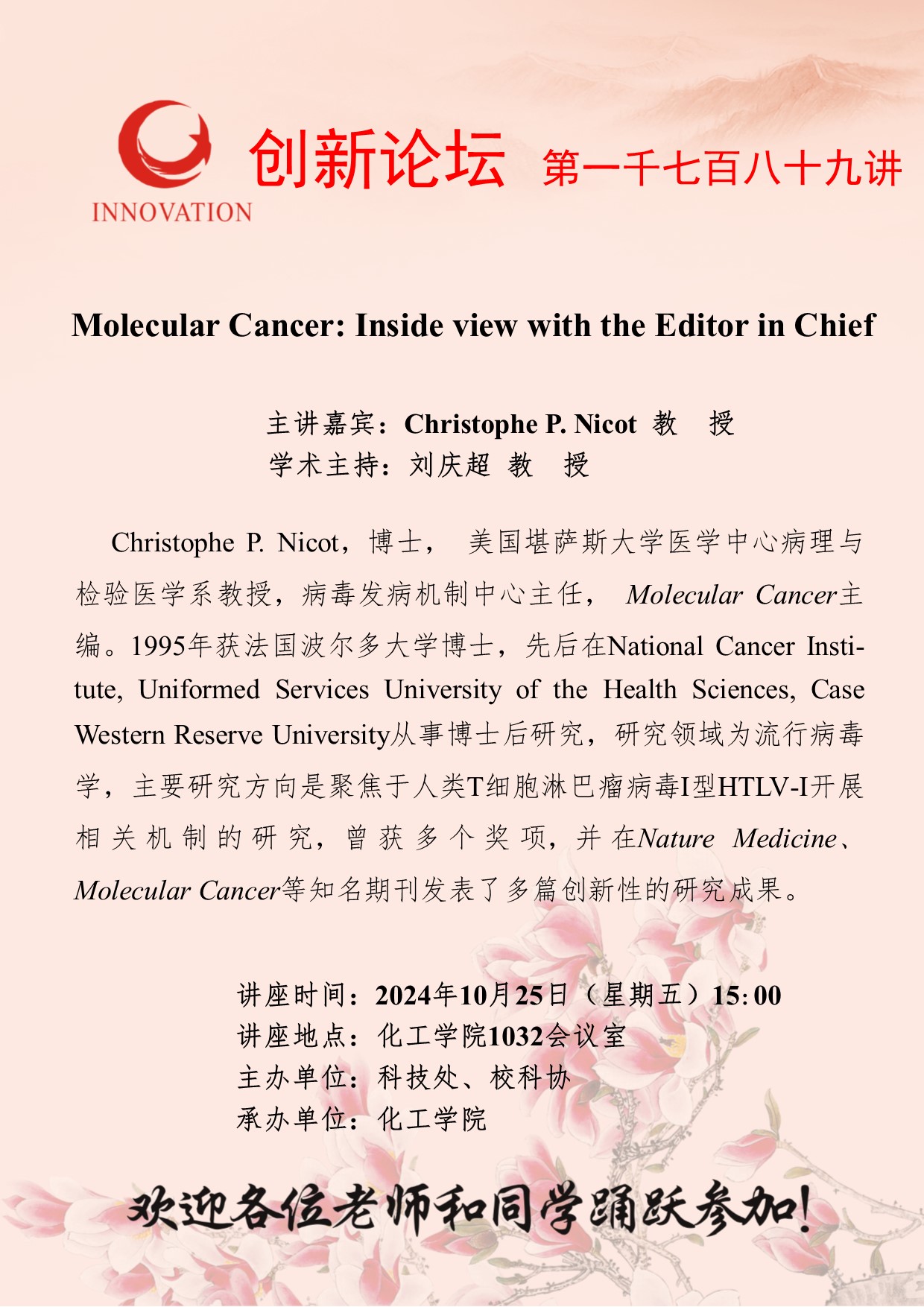 Christophe P. Nicot 教授 古天乐代言太阳集团城网址创新论坛第一千七百八十九讲:Molecular Cancer: Inside view with the Editor in Chief 讲座时间 2024年10月25日(星期五)15:00 讲座地点 化工学院1032会议室 讲座人介绍 Christophe P. Nicot 教授 讲座内容