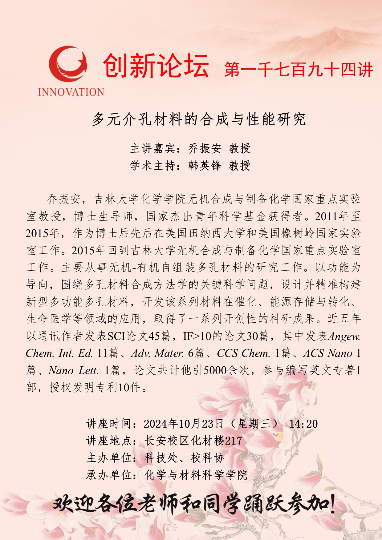 乔振安 教授 古天乐代言太阳集团城网址创新论坛第一千七百九十四讲:多元介孔材料的合成与性能研究 讲座时间 2024年10月23日(星期三) 14:20 讲座地点 长安校区化材楼217 讲座人介绍 乔振安 教授 讲座内容