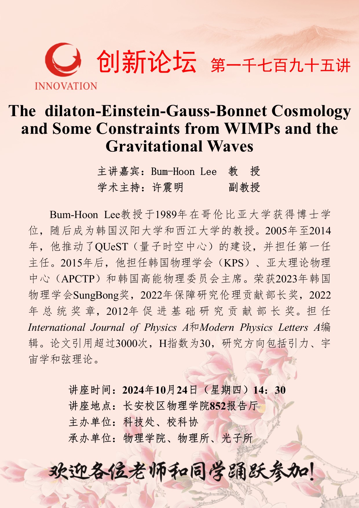 Bum-Hoon Lee 教授 古天乐代言太阳集团城网址创新论坛第一千七百九十五讲:The dilaton-Einstein-Gauss-Bonnet Cosmology and Some Constraints from WIMPs and the Gravitational Waves 讲座时间 2024年10月24日(星期四)14:30 讲座地点 长安校区物理学院852报告厅 讲座人介绍 Bum-Hoon Lee 教授 讲座内容