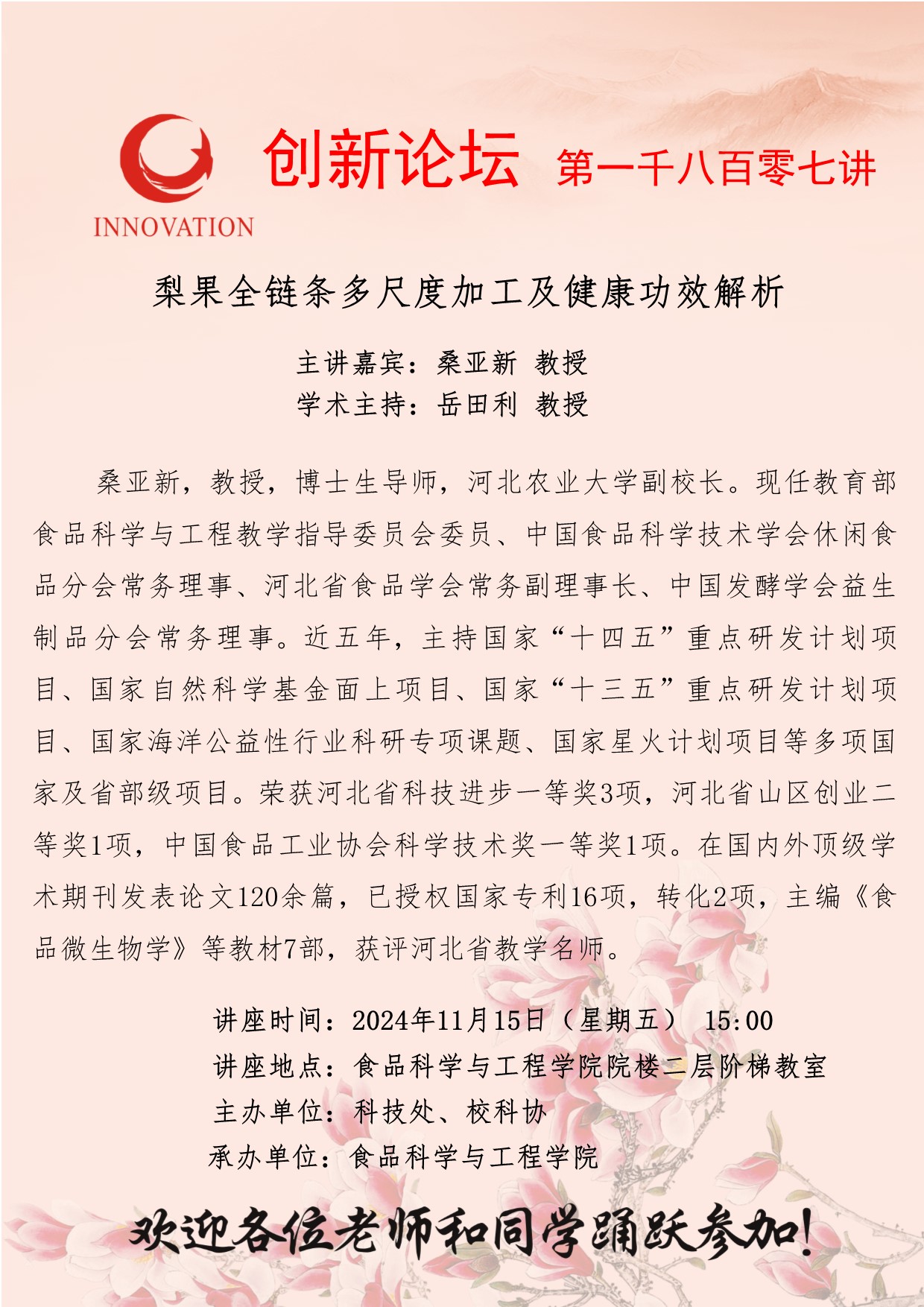 桑亚新 教授 古天乐代言太阳集团城网址创新论坛第一千八百零七讲: 梨果全链条多尺度加工及健康功效解析 讲座时间 2024年11月15日(星期五) 15:00 讲座地点 食品科学与工程学院院楼二层阶梯教室 讲座人介绍 桑亚新 教授 讲座内容