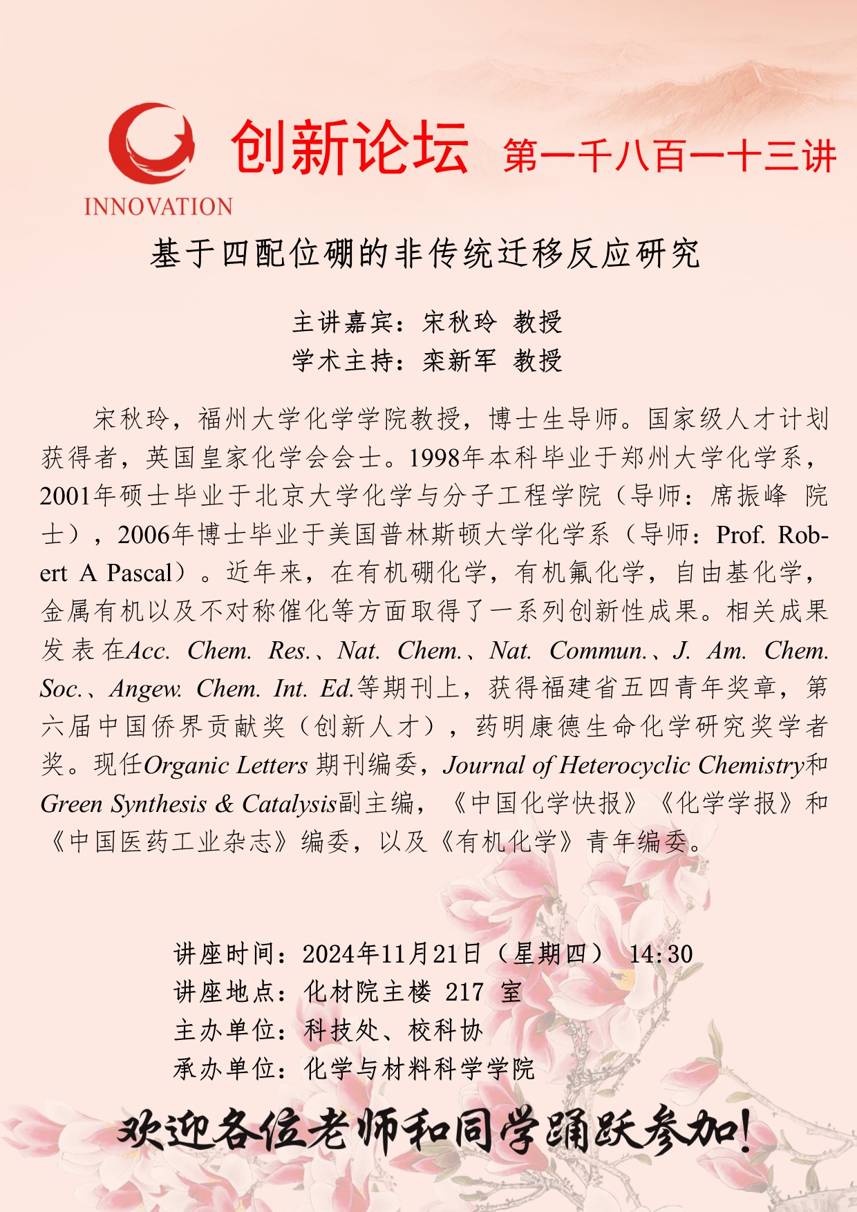 宋秋玲 教授 古天乐代言太阳集团城网址创新论坛第一千八百一十三讲:基于四配位硼的非传统迁移反应研究 讲座时间 2024年11月21日(星期四) 14:30 讲座地点 化材院主楼 217 室 讲座人介绍 宋秋玲 教授 讲座内容