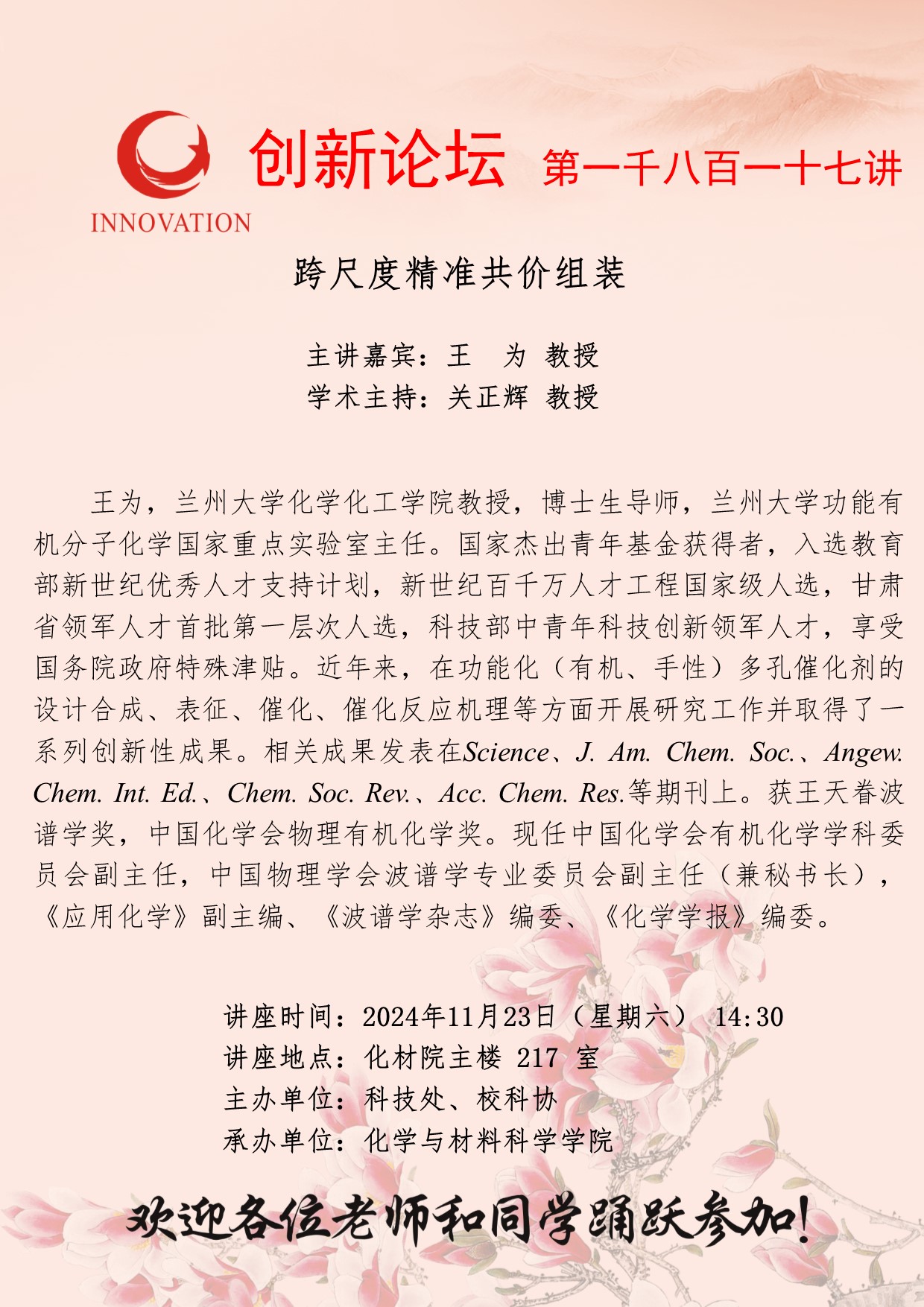 王为 教授 古天乐代言太阳集团城网址创新论坛第一千八百一十七讲:跨尺度精准共价组装 讲座时间 2024年11月23日(星期六) 14:30 讲座地点 化材院主楼 217 室 讲座人介绍 王为 教授 讲座内容