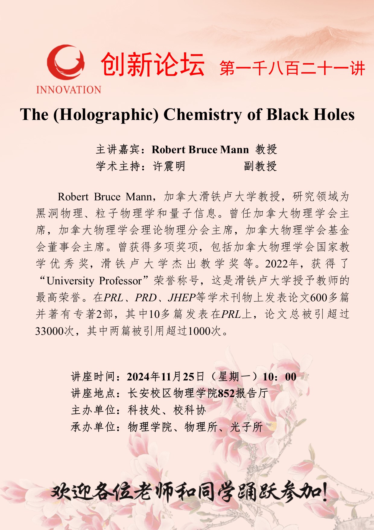 Robert Bruce Mann 教授 古天乐代言太阳集团城网址创新论坛第一千八百二十一讲:The (Holographic) Chemistry of Black Holes 讲座时间 2024年11月25日(星期一)10:00 讲座地点 长安校区物理学院852报告厅 讲座人介绍 Robert Bruce Mann 教授 讲座内容