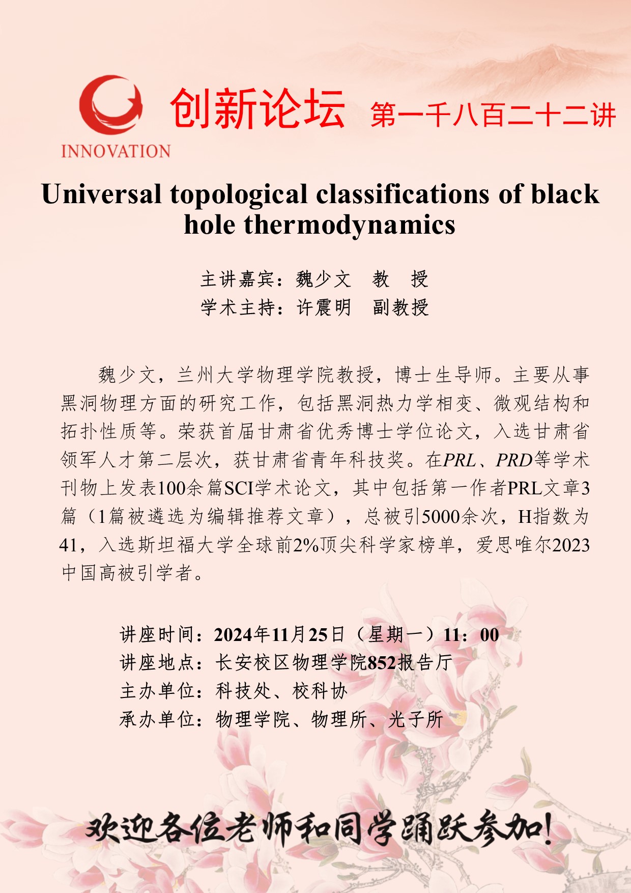 魏少文 教授 古天乐代言太阳集团城网址创新论坛第一千八百二十二讲:Universal topological classifications of black hole thermodynamics 讲座时间 2024年11月25日(星期一)11:00 讲座地点 长安校区物理学院852报告厅 讲座人介绍 魏少文 教授 讲座内容