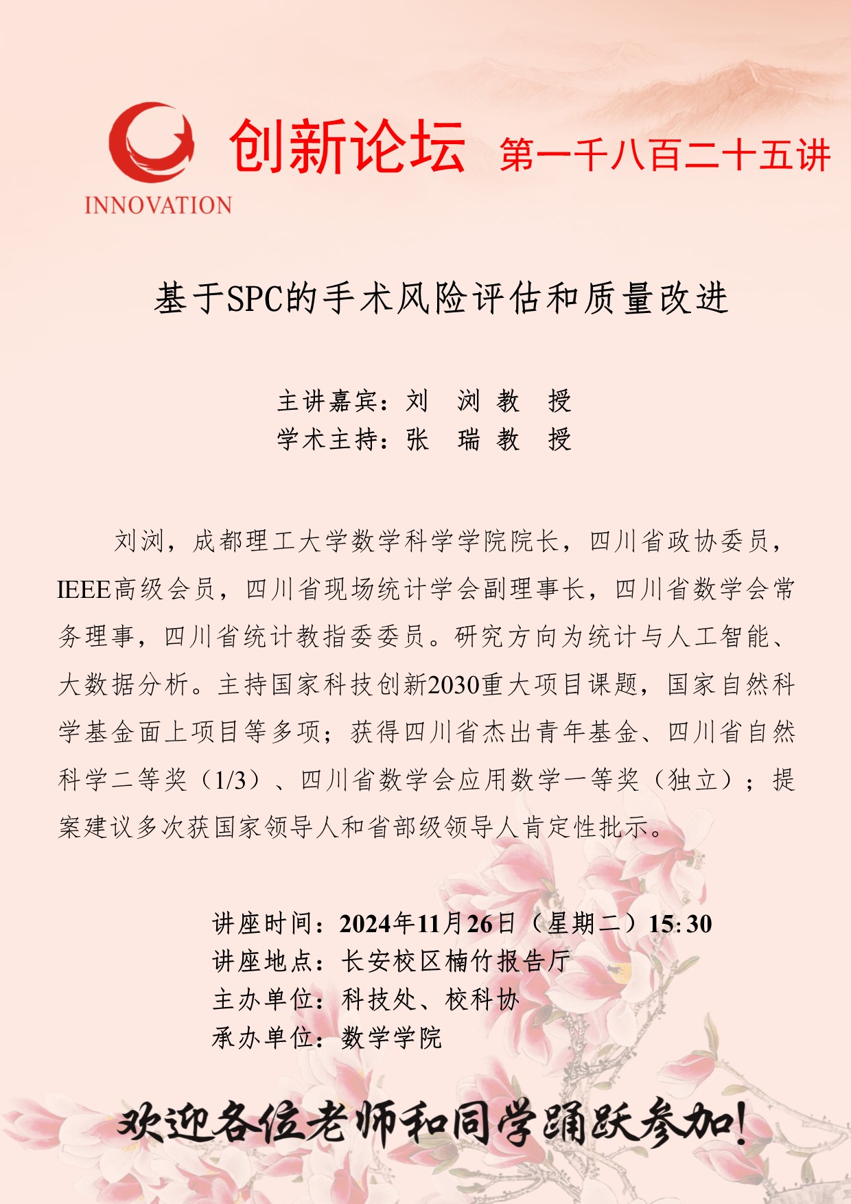 刘浏 教授 古天乐代言太阳集团城网址创新论坛第一千八百二十五讲:基于SPC的手术风险评估和质量改进 讲座时间 2024年11月26日(星期二)15:30 讲座地点 长安校区楠竹报告厅 讲座人介绍 刘浏 教授 讲座内容
