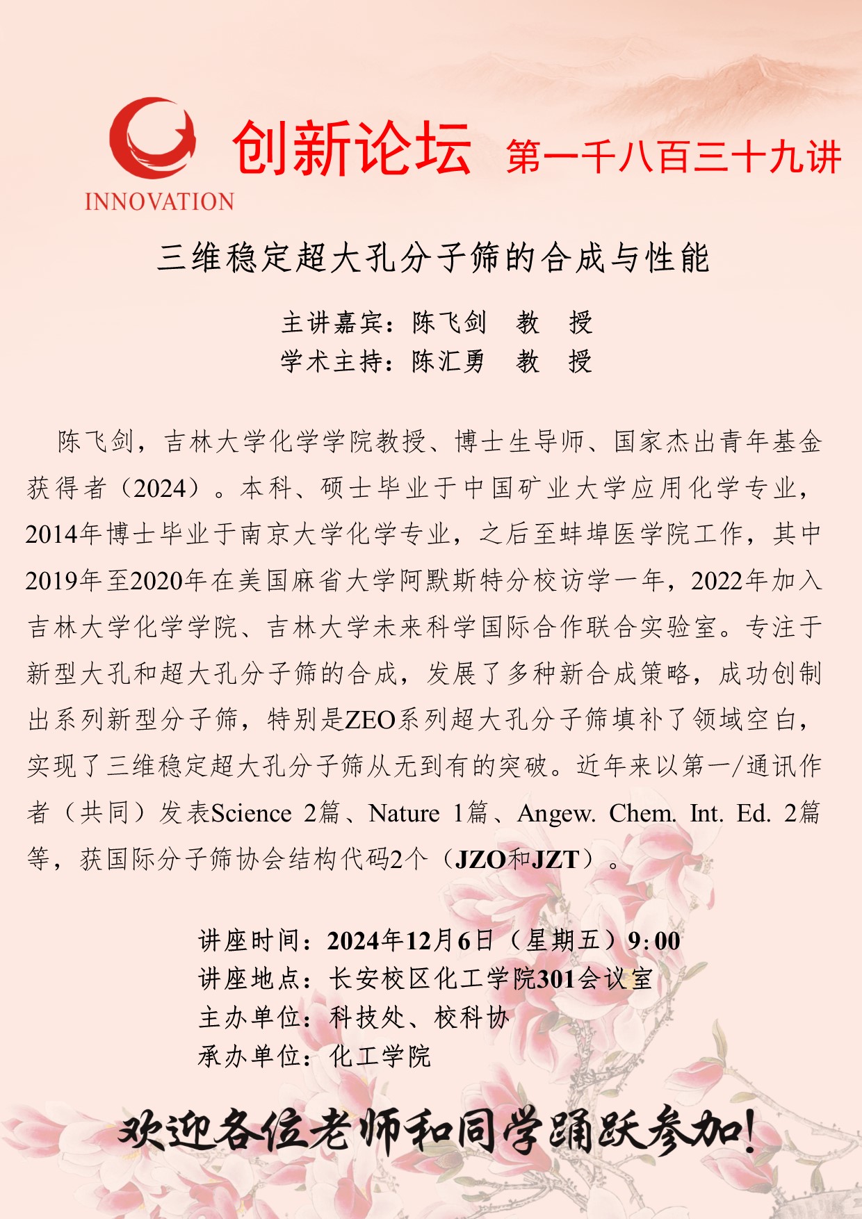 陈飞剑 教授 古天乐代言太阳集团城网址创新论坛第一千八百三十九讲:三维稳定超大孔分子筛的合成与性能 讲座时间 2024年12月6日(星期五)9:00 讲座地点 长安校区化工学院301会议室 讲座人介绍 陈飞剑 教授 讲座内容 嗯