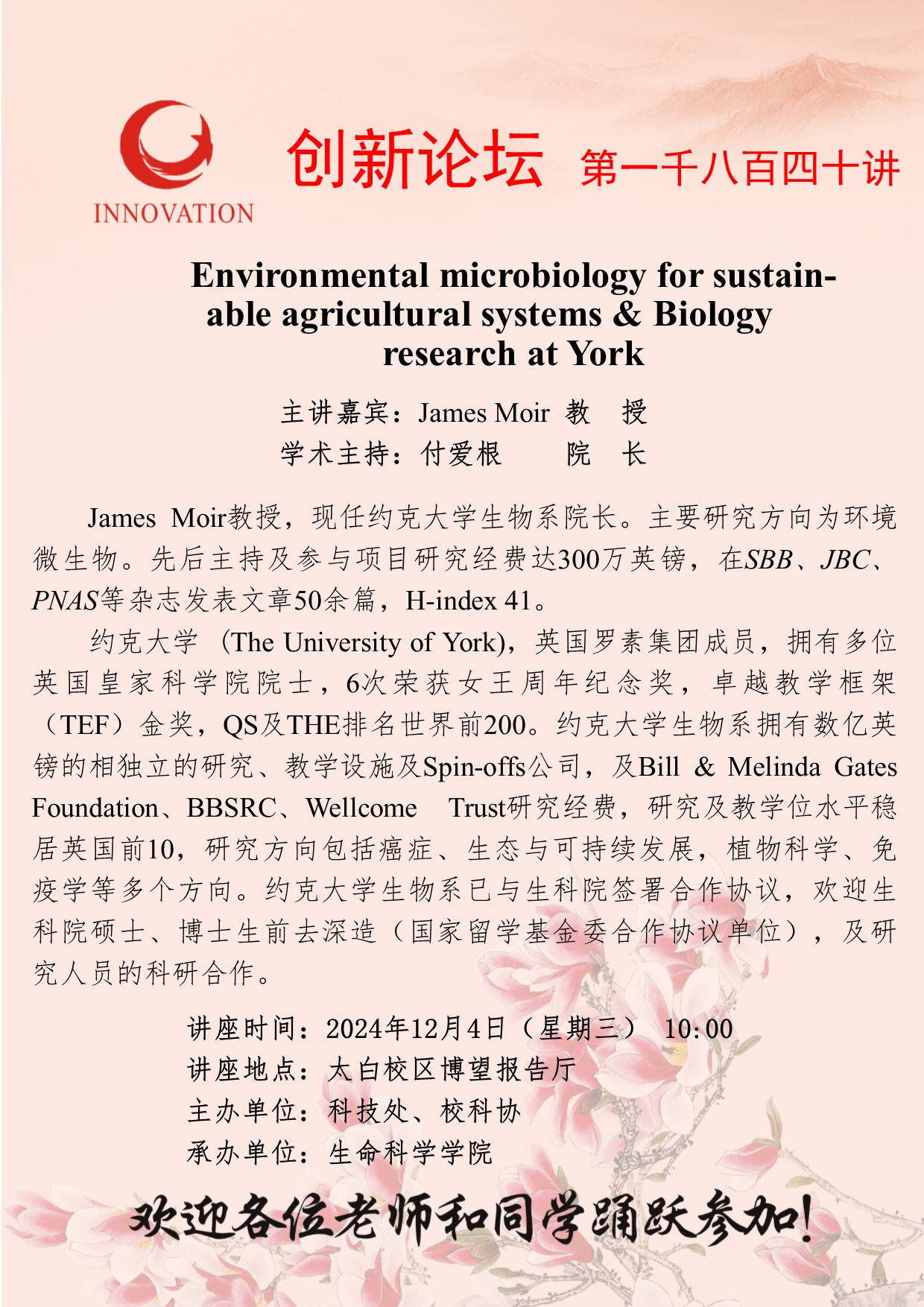 James Moir 教授 古天乐代言太阳集团城网址创新论坛第一千八百四十讲:Environmental microbiology for sustainable agricultural systems & Biology research at York 讲座时间 2024年12月4日(星期三) 10:00 讲座地点 太白校区博望报告厅 讲座人介绍 James Moir 教授 讲座内容