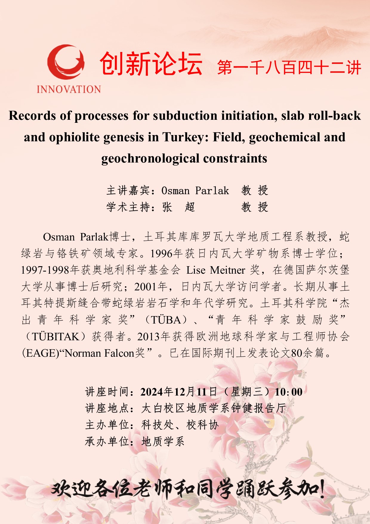 Osman Parlak 教授 古天乐代言太阳集团城网址创新论坛第一千八百四十二讲:Records of processes for subduction initiation, slab roll-back and ophiolite genesis in Turkey: Field, geochemical and geochronological constraints 讲座时间 2024年12月11日(星期三)10:00 讲座地点 太白校区地质学系钟健报告厅 讲座人介绍 Osman Parlak 教授 讲座内容