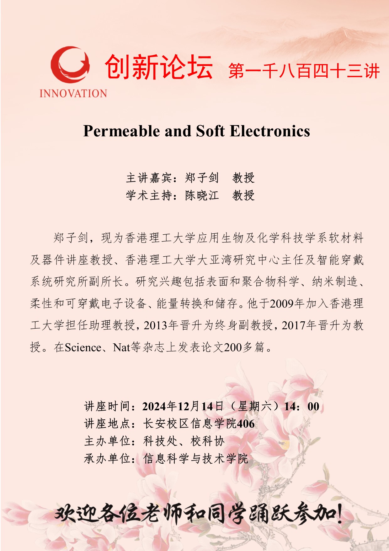 郑子剑 教授 古天乐代言太阳集团城网址创新论坛第一千八百四十三讲:Permeable and Soft Electronics 讲座时间 2024年12月14日(星期六)14:00 讲座地点 长安校区信息学院406 讲座人介绍 郑子剑 教授 讲座内容