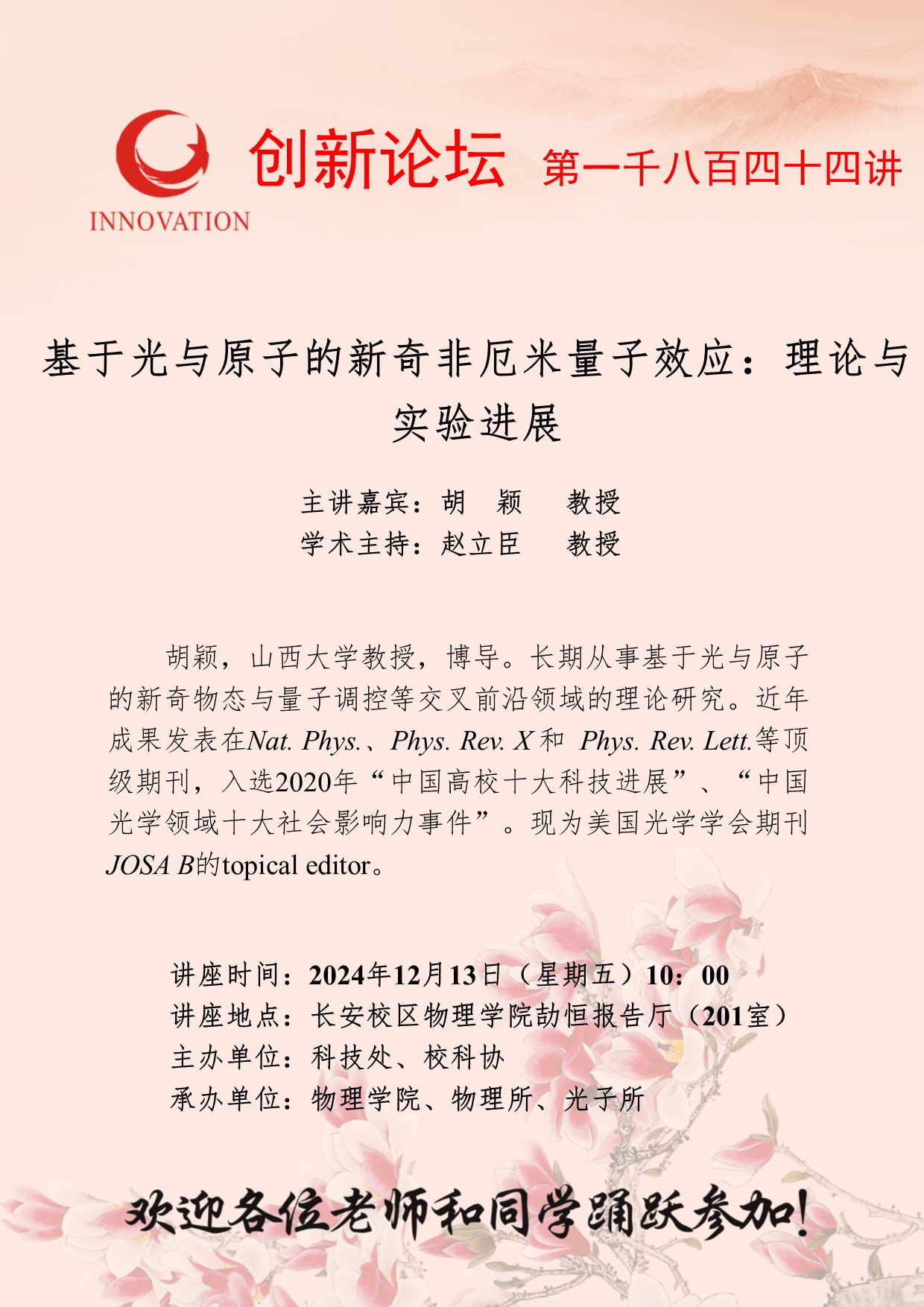 胡颖 教授 古天乐代言太阳集团城网址创新论坛第一千八百四十四讲:基于光与原子的新奇非厄米量子效应:理论与实验进展 讲座时间 2024年12月13日(星期五)10:00 讲座地点 长安校区物理学院劼恒报告厅(201室) 讲座人介绍 胡颖 教授 讲座内容