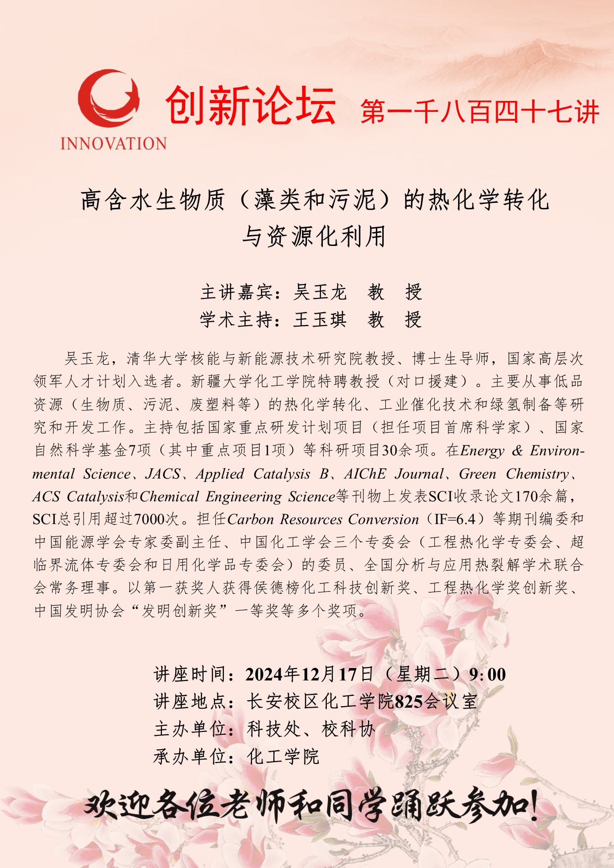 吴玉龙 教授 古天乐代言太阳集团城网址创新论坛第一千八百四十七讲:高含水生物质(藻类和污泥)的热化学转化与资源化利用 讲座时间 2024年12月17日(星期二)9:00 讲座地点 长安校区化工学院825会议室 讲座人介绍 吴玉龙 教授 讲座内容
