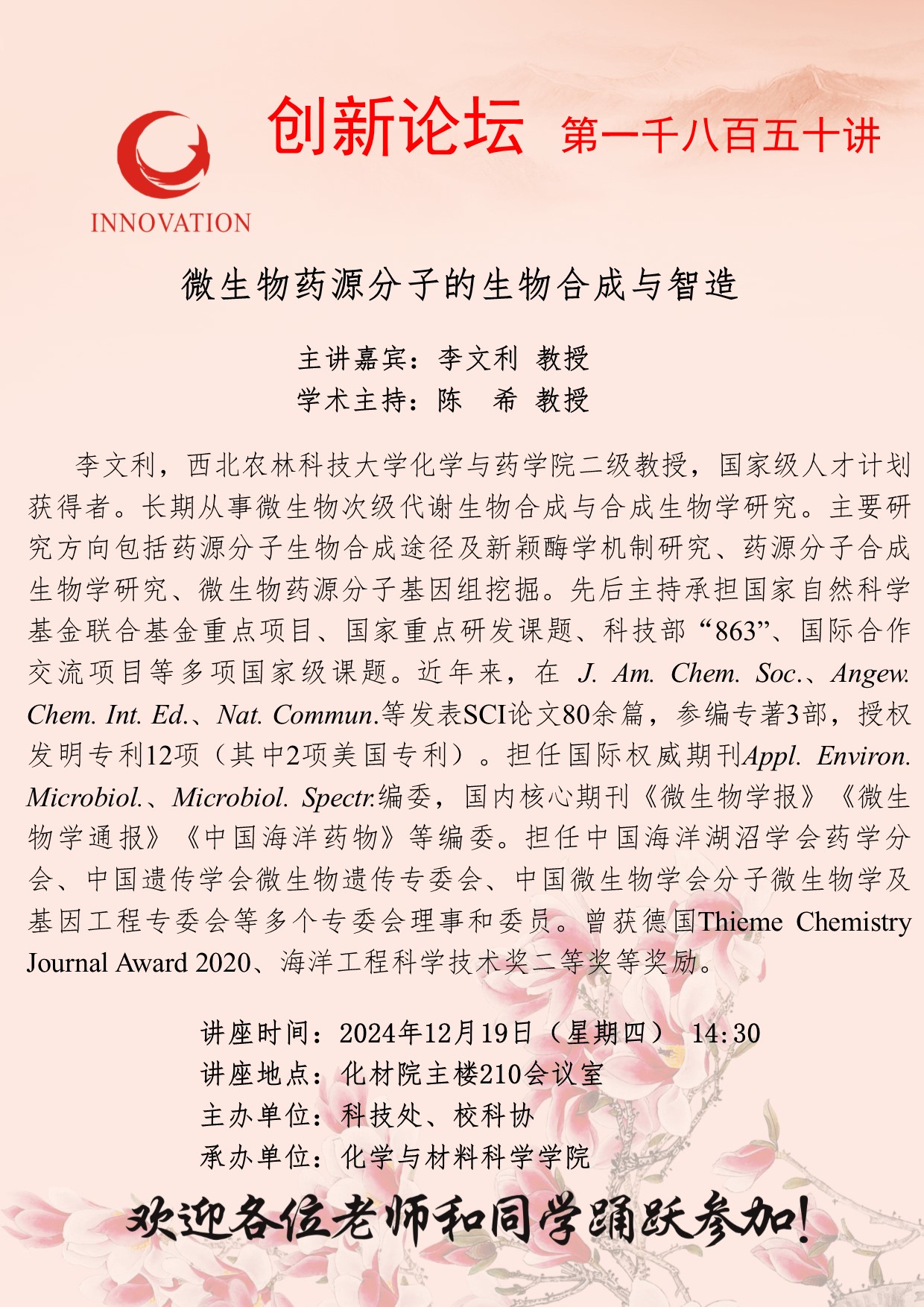 李文利 教授 古天乐代言太阳集团城网址创新论坛第一千八百五十讲:微生物药源分子的生物合成与智造 讲座时间 2024年12月19日(星期四) 14:30 讲座地点 化材院主楼210会议室 讲座人介绍 李文利 教授 讲座内容