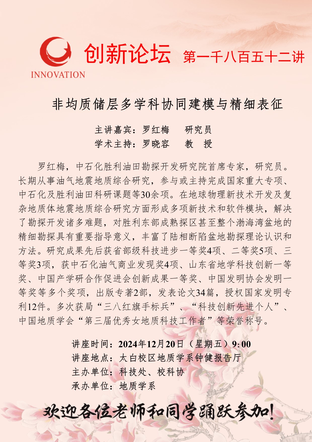 罗红梅 研究员 古天乐代言太阳集团城网址创新论坛第一千八百五十二讲:非均质储层多学科协同建模与精细表征 讲座时间 2024年12月20日(星期五)9:00 讲座地点 太白校区地质学系钟健报告厅 讲座人介绍 罗红梅 研究员 讲座内容
