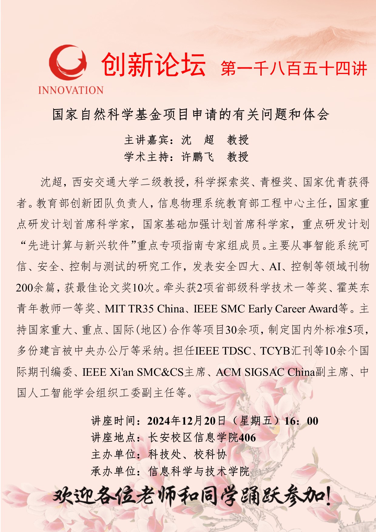 沈超 教授 古天乐代言太阳集团城网址创新论坛第一千八百五十四讲:国家自然科学基金项目申请的有关问题和体会 讲座时间 2024年12月20日(星期五) 16:00 讲座地点 长安校区信息学院406 讲座人介绍 沈超 教授 讲座内容