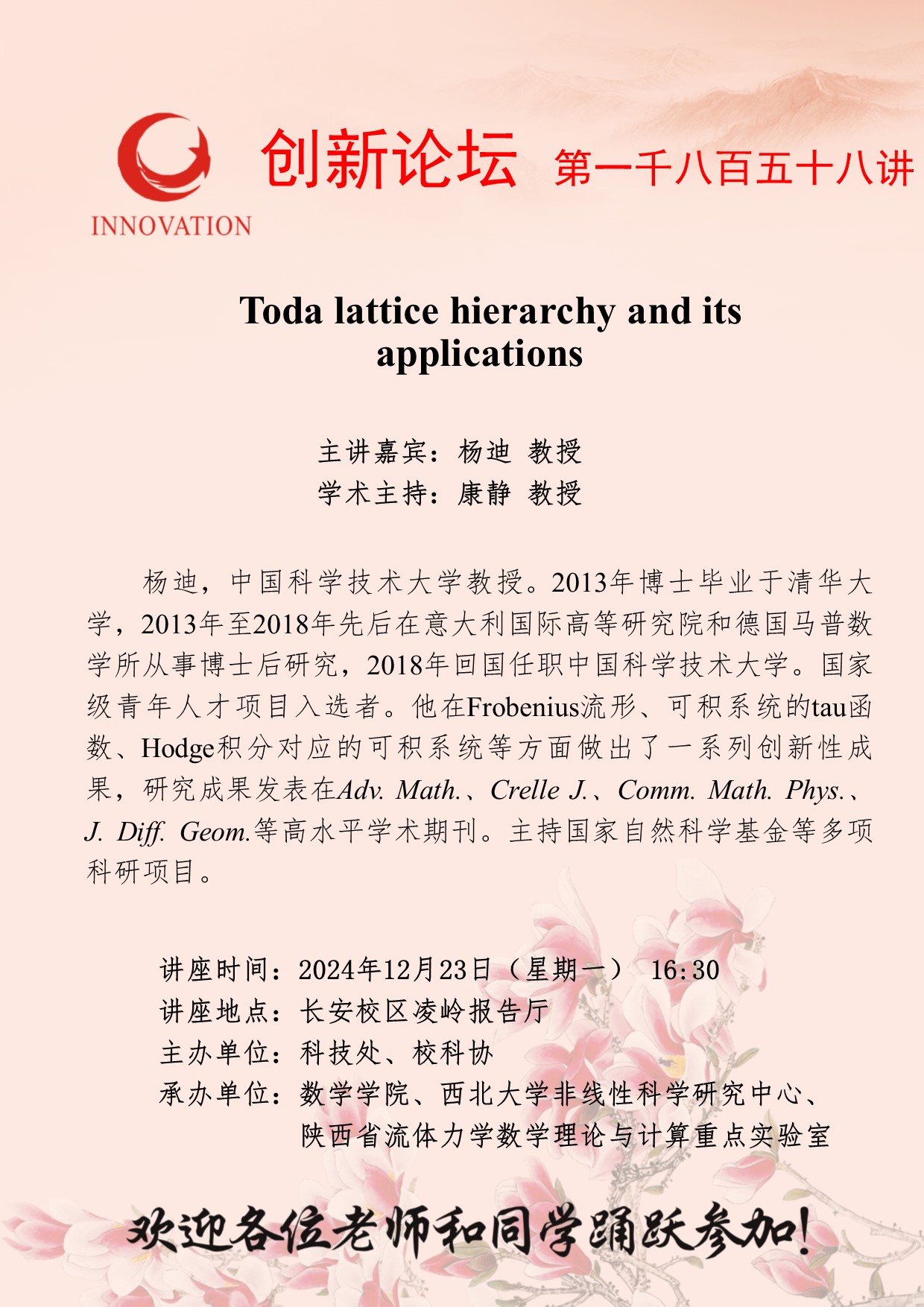 杨迪 教授 古天乐代言太阳集团城网址创新论坛第一千八百五十八讲:Toda lattice hierarchy and its applications 讲座时间 2024年12月23日(星期一) 16:30 讲座地点 长安校区凌岭报告厅 讲座人介绍 杨迪 教授 讲座内容