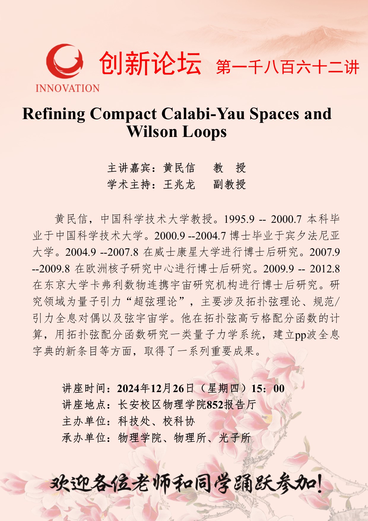 黄民信 教授 古天乐代言太阳集团城网址创新论坛第一千八百六十二讲:Refining Compact Calabi-Yau Spaces and Wilson Loops 讲座时间 2024年12月26日(星期四)15:00 讲座地点 长安校区物理学院852报告厅 讲座人介绍 黄民信 教授 讲座内容