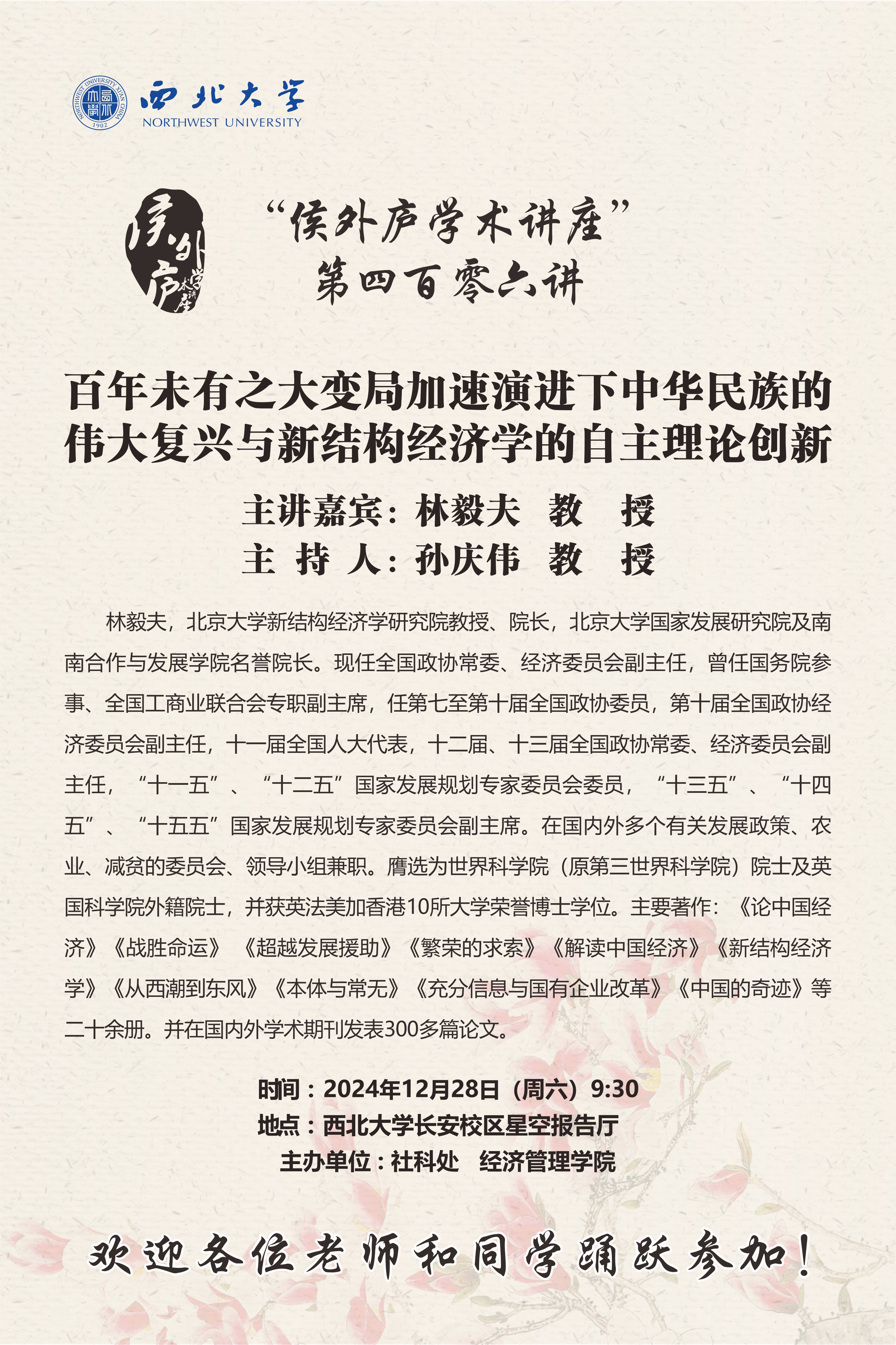 林毅夫 教授 “侯外庐学术讲座”第四百零六讲:百年未有之大变局加速演进下中华民族的伟大复兴与新结构经济学的自主理论创新 讲座时间 2024年12月28日(周六)9:30 讲座地点 古天乐代言太阳集团城网址长安校区星空报告厅 讲座人介绍 林毅夫 教授 讲座内容