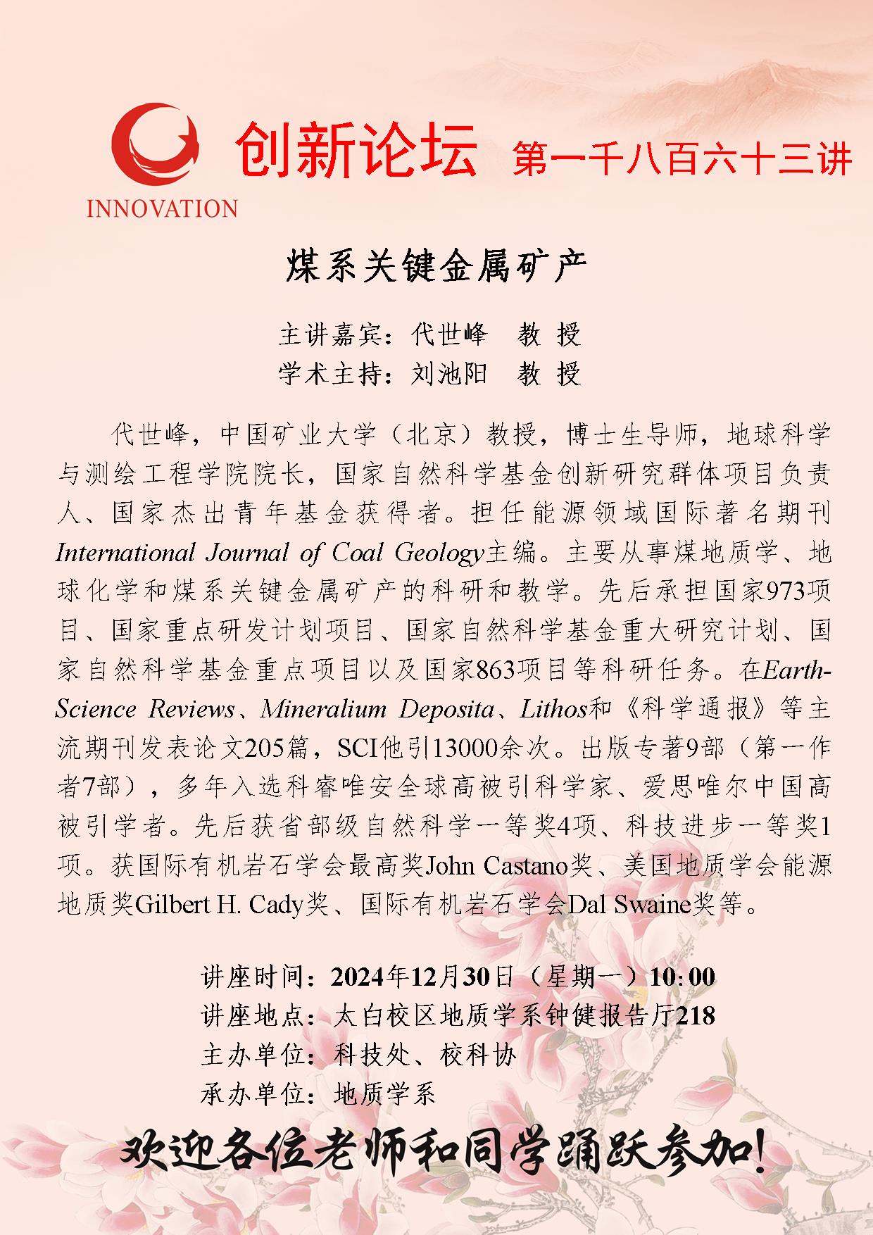 代世峰 教授 古天乐代言太阳集团城网址创新论坛第一千八百六十三讲:煤系关键金属矿产 讲座时间 2024年12月30日(星期一)10:00 讲座地点 太白校区地质学系钟健报告厅218 讲座人介绍 代世峰 教授 讲座内容