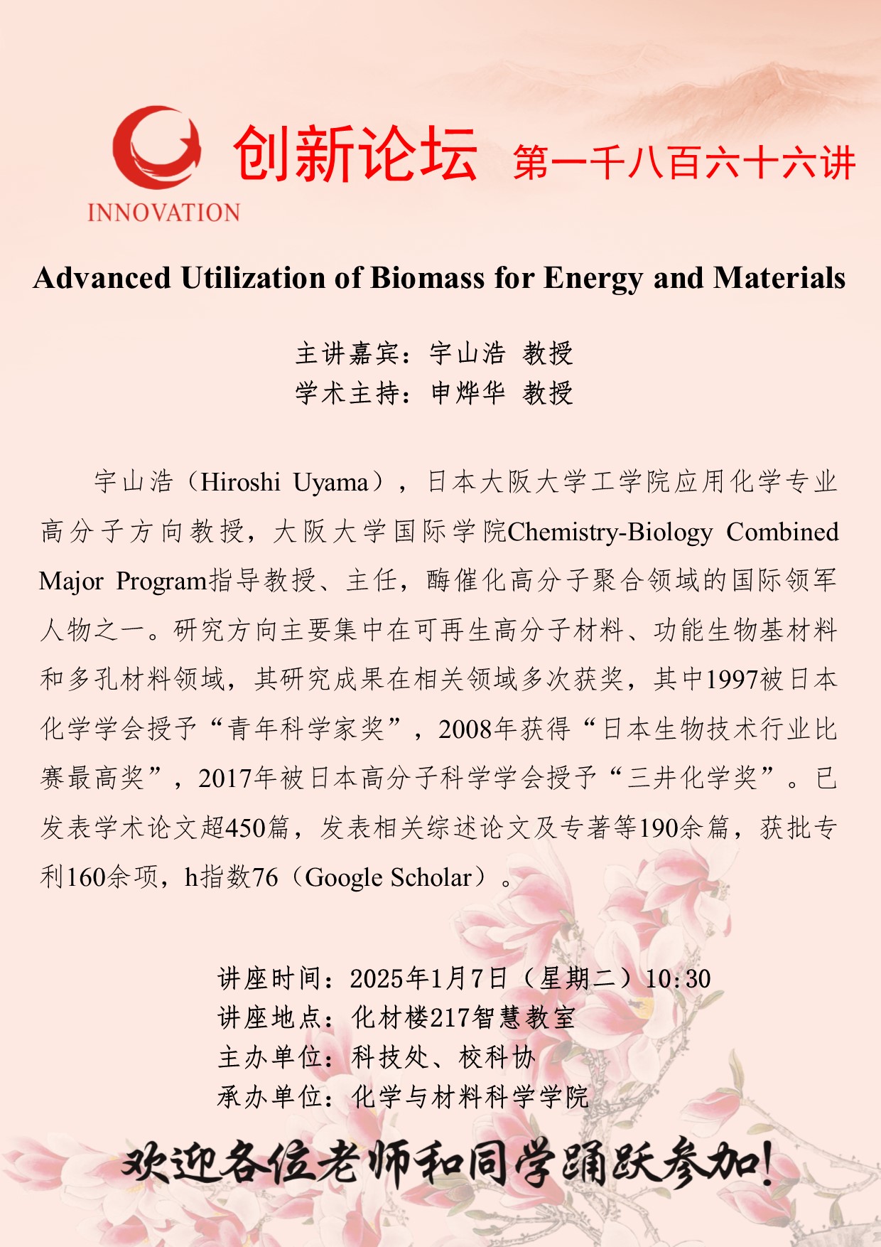 宇山浩 教授 古天乐代言太阳集团城网址创新论坛第一千八百六十六讲:Advanced Utilization of Biomass for Energy and Materials 讲座时间 2025年1月7日(星期二)10:30 讲座地点 化材楼217智慧教室 讲座人介绍 宇山浩 教授 讲座内容