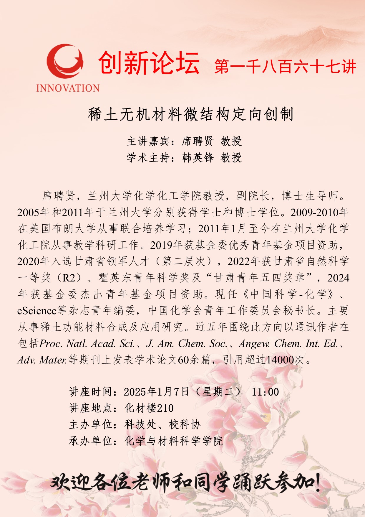 席聘贤 教授 古天乐代言太阳集团城网址创新论坛第一千八百六十七讲: 稀土无机材料微结构定向创制 讲座时间 2025年1月7日(星期二)11:00 讲座地点 化材楼210 讲座人介绍 席聘贤 教授 讲座内容