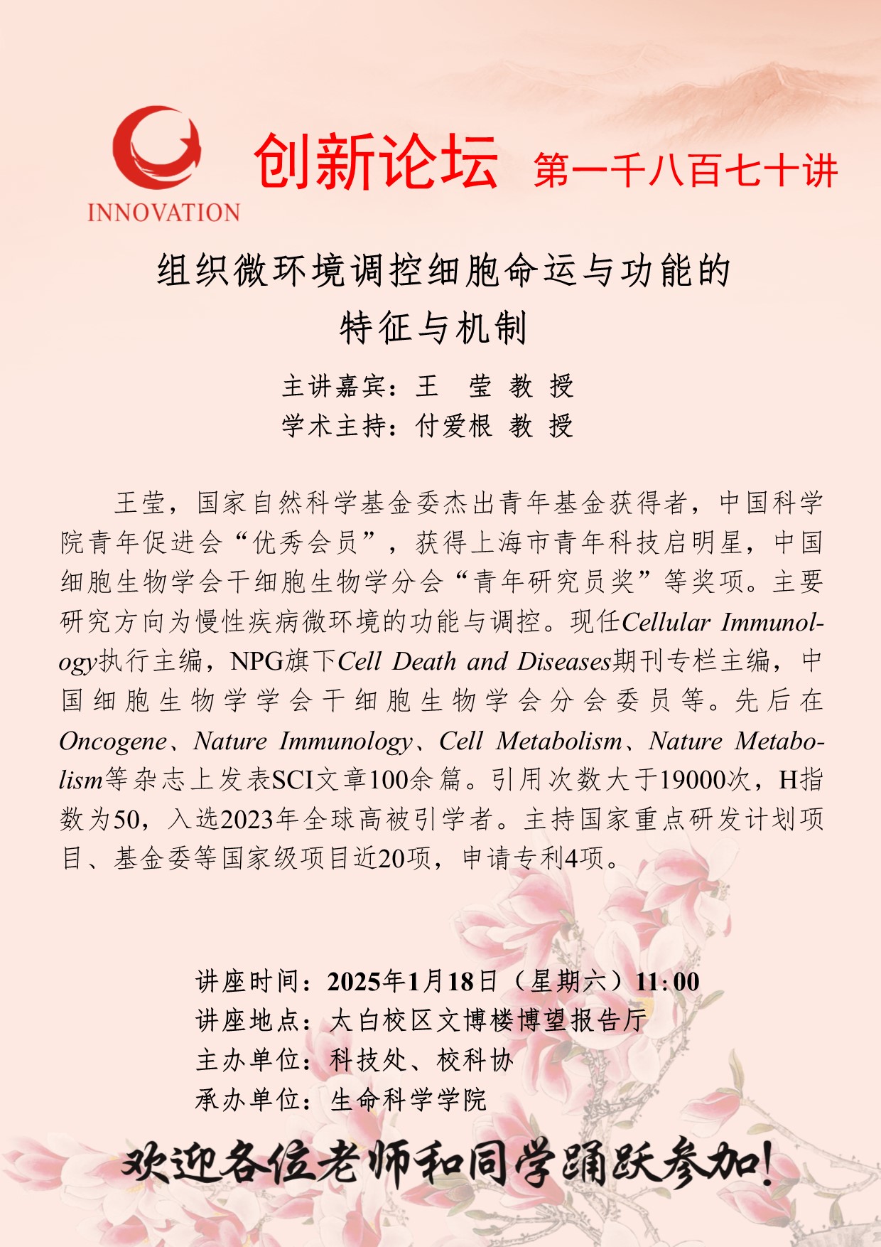 王莹 教授 古天乐代言太阳集团城网址创新论坛第一千八百七十讲:组织微环境调控细胞命运与功能的特征与机制 讲座时间 2025年1月18日(星期六)11:00 讲座地点 太白校区文博楼博望报告厅 讲座人介绍 王莹 教授 讲座内容