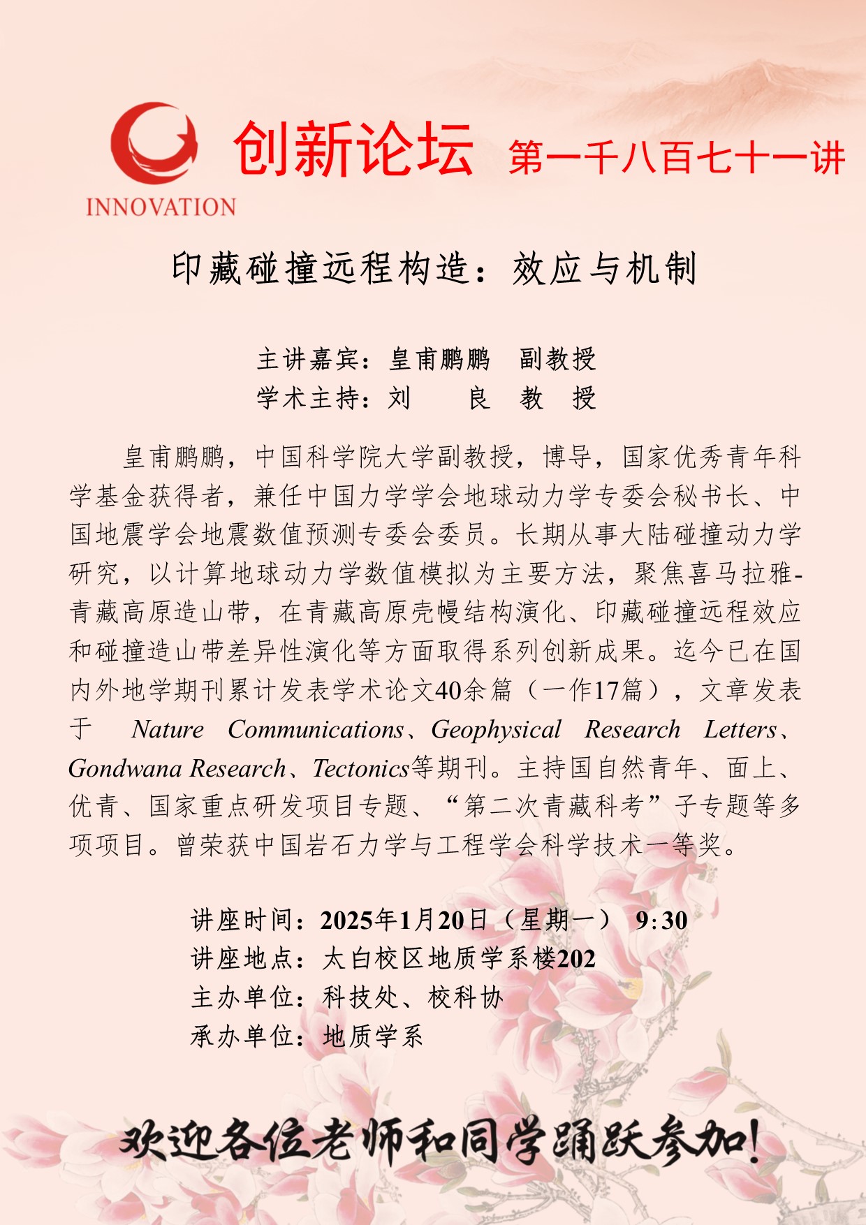 皇甫鹏鹏 副教授 古天乐代言太阳集团城网址创新论坛第一千八百七十一讲:印藏碰撞远程构造:效应与机制 讲座时间 2025年1月20日(星期一) 9:30 讲座地点 太白校区地质学系楼202 讲座人介绍 皇甫鹏鹏 副教授 讲座内容