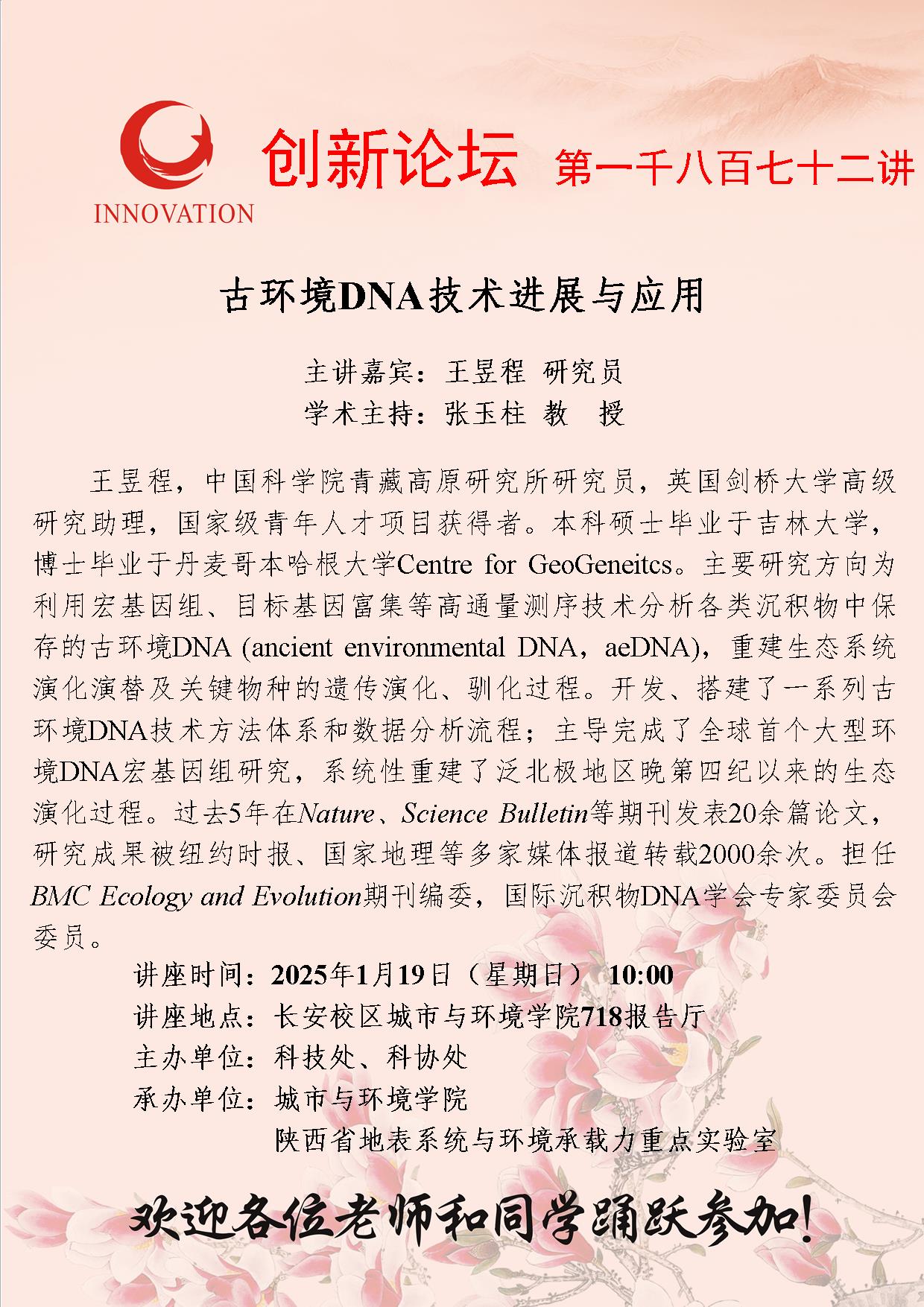 王昱程 研究员 古天乐代言太阳集团城网址创新论坛第一千八百七十二讲:古环境DNA技术进展与应用 讲座时间 2025年1月19日(星期日) 10:00 讲座地点 长安校区城市与环境学院718报告厅 讲座人介绍 王昱程 研究员 讲座内容