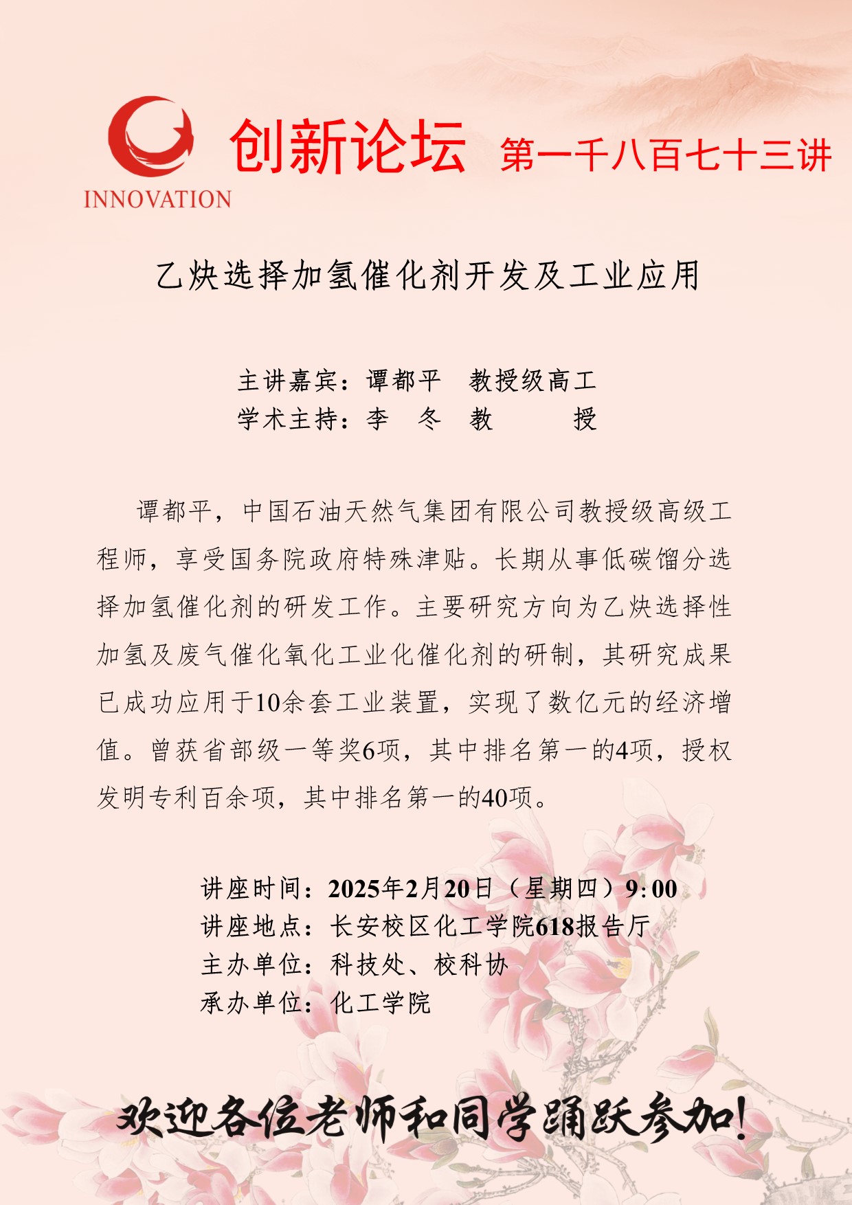 谭都平 教授级高工 古天乐代言太阳集团城网址创新论坛第一千八百七十三讲:乙炔选择加氢催化剂开发及工业应用 讲座时间 2025年2月20日(星期四)9:00 讲座地点 长安校区化工学院618报告厅 讲座人介绍 谭都平 教授级高工 讲座内容
