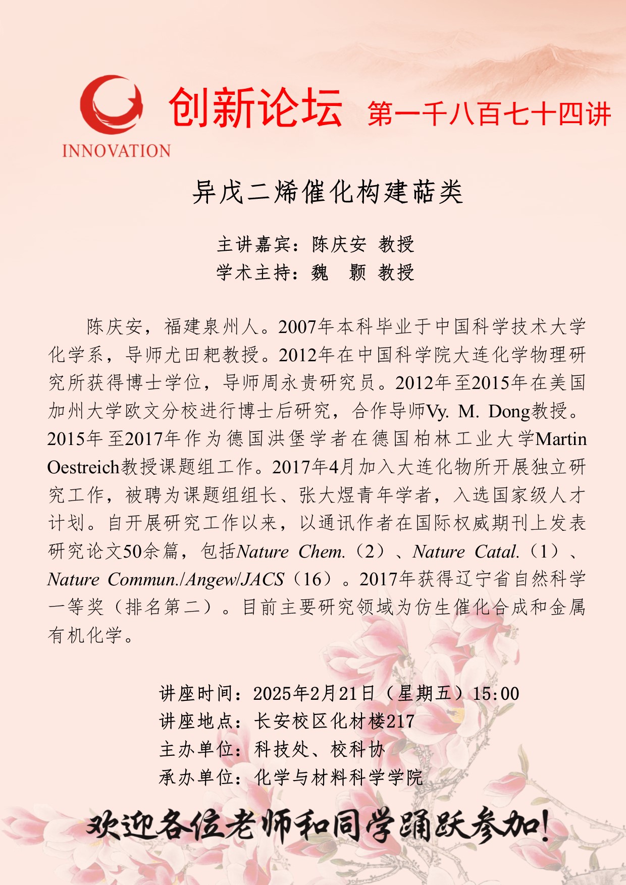 陈庆安 教授 古天乐代言太阳集团城网址创新论坛第一千八百七十四讲: 异戊二烯催化构建萜类 讲座时间 2025年2月21日(星期五)15:00 讲座地点 长安校区化材楼217 讲座人介绍 陈庆安 教授 讲座内容