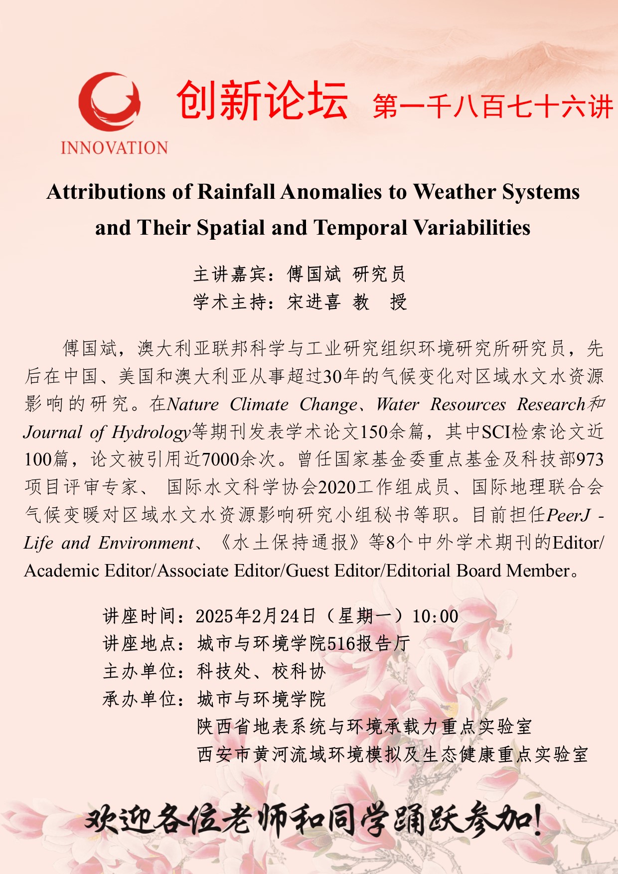 傅国斌 研究员 古天乐代言太阳集团城网址创新论坛第一千八百七十六讲:Attributions of Rainfall Anomalies to Weather Systems and Their Spatial and Temporal Variabilities 讲座时间 2025年2月24日(星期一)10:00 讲座地点 城市与环境学院516报告厅 讲座人介绍 傅国斌 研究员 讲座内容