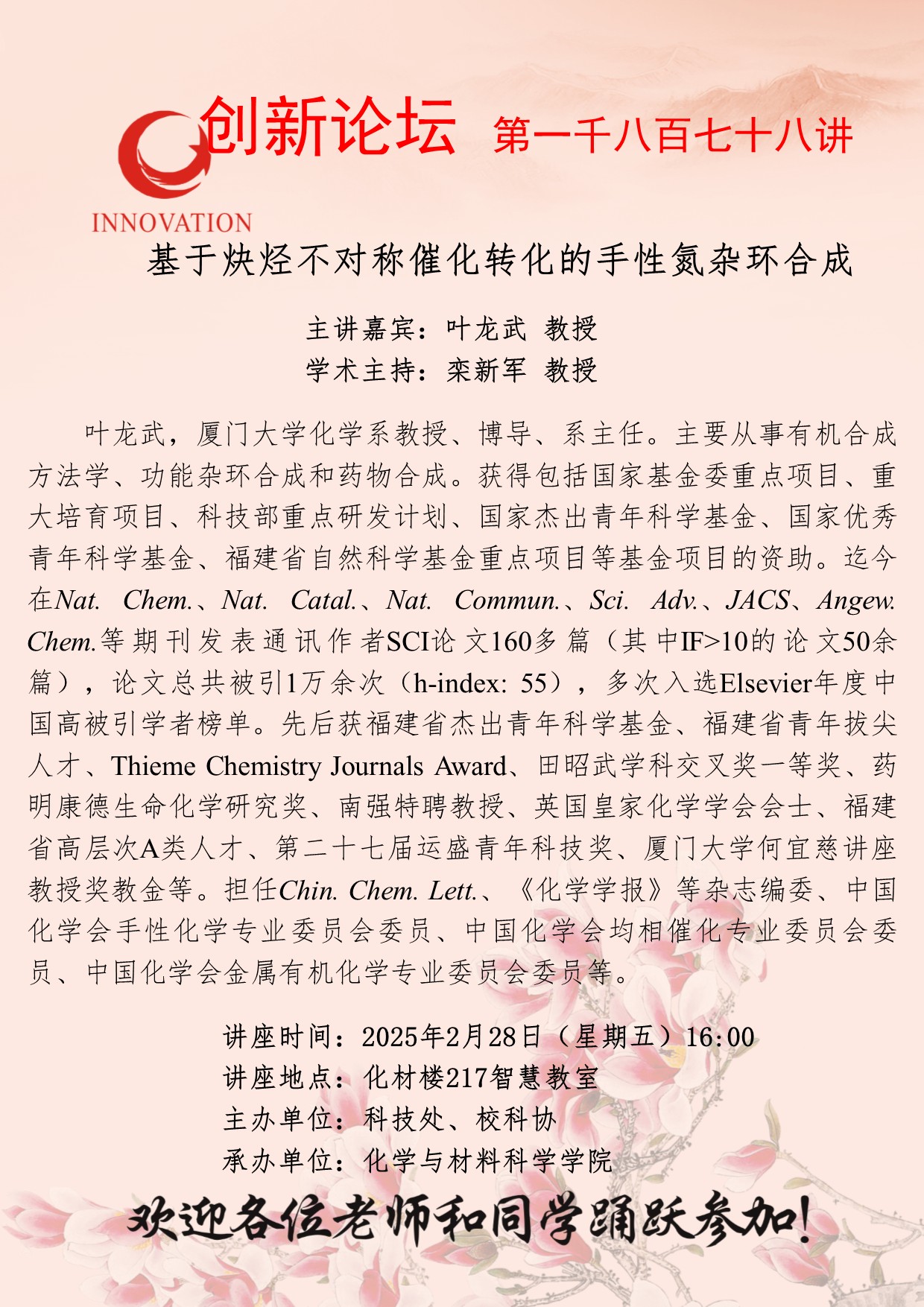 叶龙武 教授 古天乐代言太阳集团城网址创新论坛第一千八百七十八讲:基于炔烃不对称催化转化的手性氮杂环合成 讲座时间 2025年2月28日(星期五)16:00 讲座地点 化材楼217智慧教室 讲座人介绍 叶龙武 教授 讲座内容