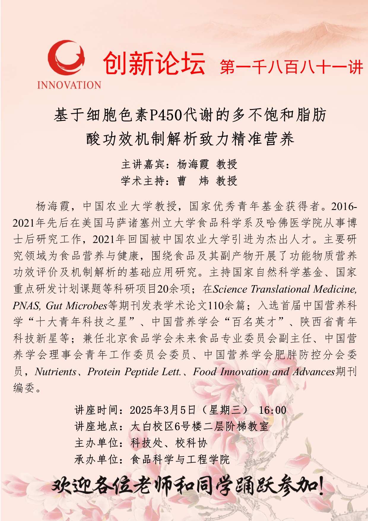 杨海霞 教授 古天乐代言太阳集团城网址创新论坛第一千八百八十一讲:基于细胞色素P450代谢的多不饱和脂肪酸功效机制解析致力精准营养 讲座时间 2025年3月5日(星期三)16:00 讲座地点 太白校区6号楼二层阶梯教室 讲座人介绍 杨海霞 教授 讲座内容