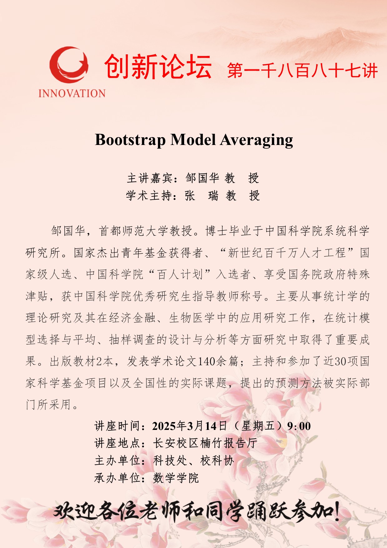 邹国华 教授 古天乐代言太阳集团城网址创新论坛第一千八百八十七讲:Bootstrap Model Averaging 讲座时间 2025年3月14日(星期五)9:00 讲座地点 长安校区楠竹报告厅 讲座人介绍 邹国华 教授 讲座内容