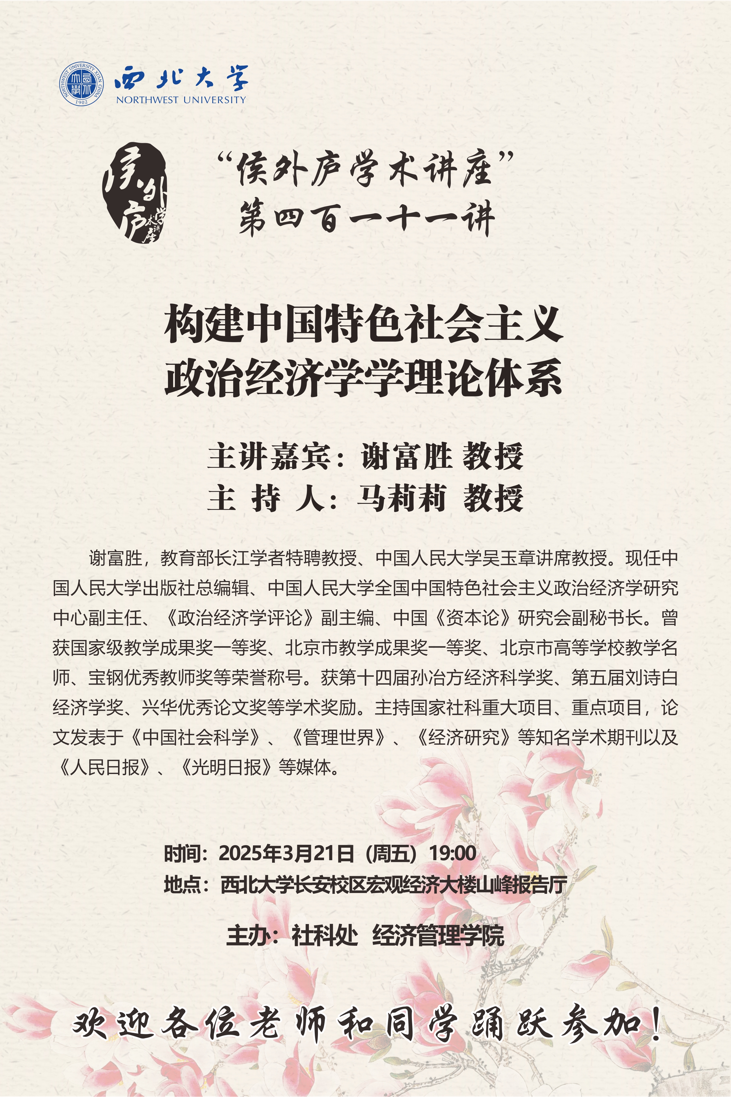 谢富胜 教授 “侯外庐学术讲座”第四百一十一讲:构建中国特色社会主义政治经济学理论体系 讲座时间 2025年3月21日(周五)19:00 讲座地点 古天乐代言太阳集团城网址长安校区宏观经济大楼山峰报告厅 讲座人介绍 谢富胜 教授 讲座内容