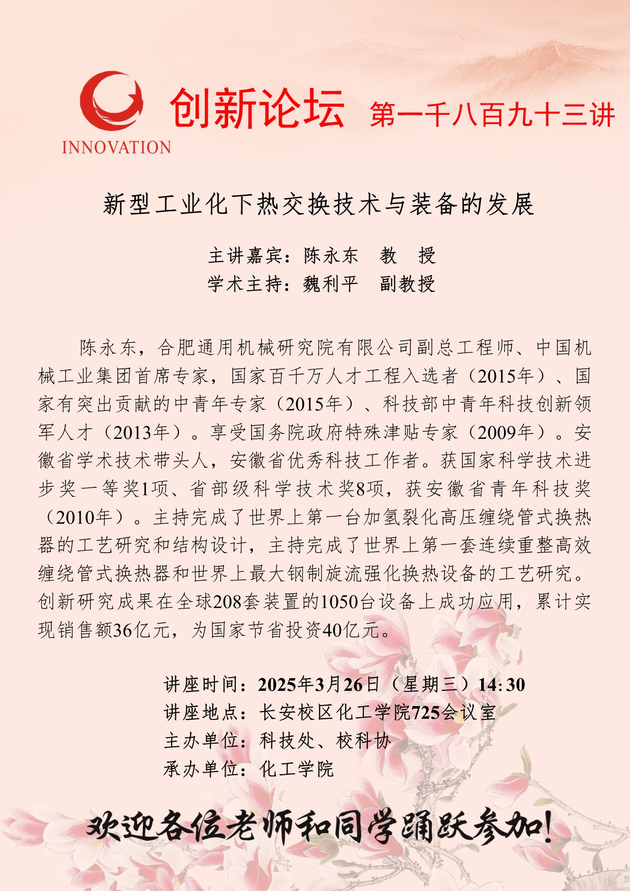 陈永东 教授 古天乐代言太阳集团城网址创新论坛第一千八百九十三讲:新型工业化下热交换技术与装备的发展 讲座时间 2025年3月26日(星期三)14:30 讲座地点 长安校区化工学院725会议室 讲座人介绍 陈永东 教授 讲座内容