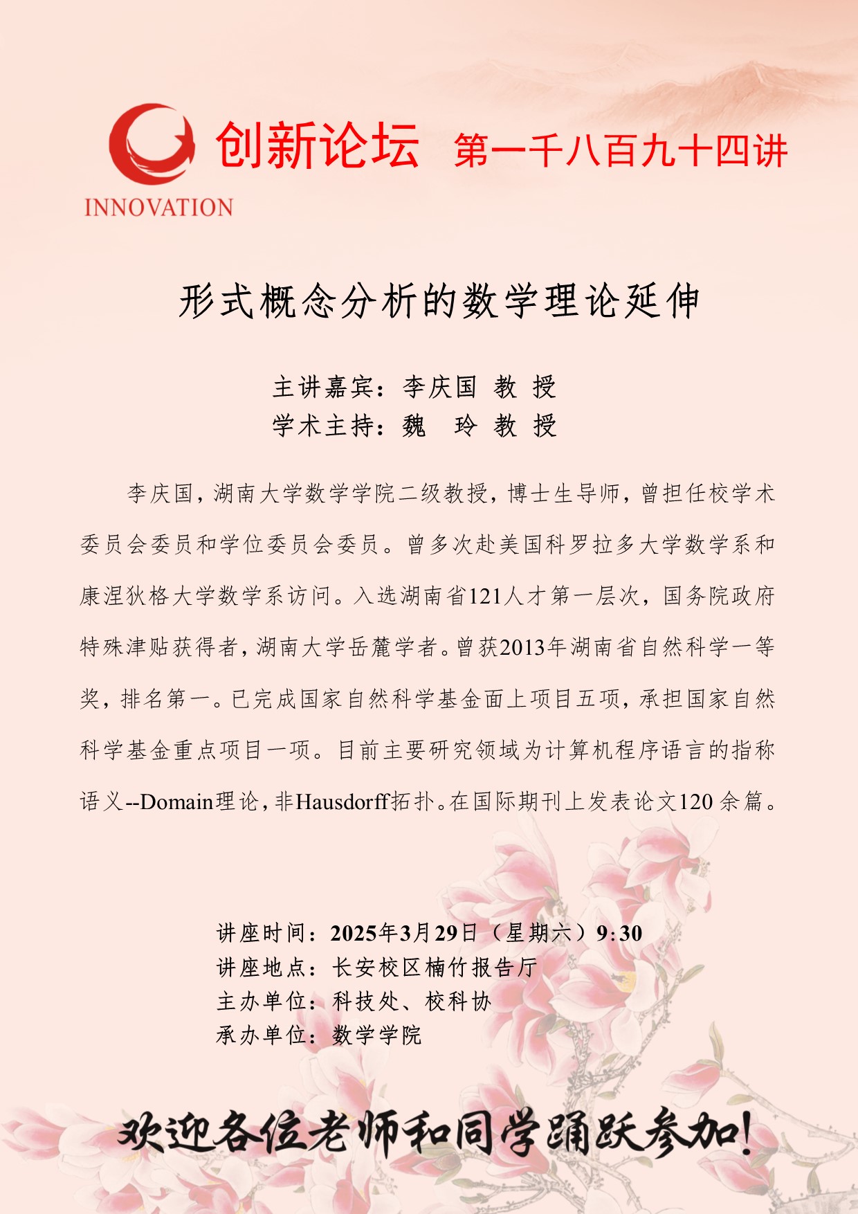 李庆国 教授 古天乐代言太阳集团城网址创新论坛第一千八百九十四讲:形式概念分析的数学理论延伸 讲座时间 2025年3月29日(星期六)9:30 讲座地点 长安校区楠竹报告厅 讲座人介绍 李庆国 教授 讲座内容