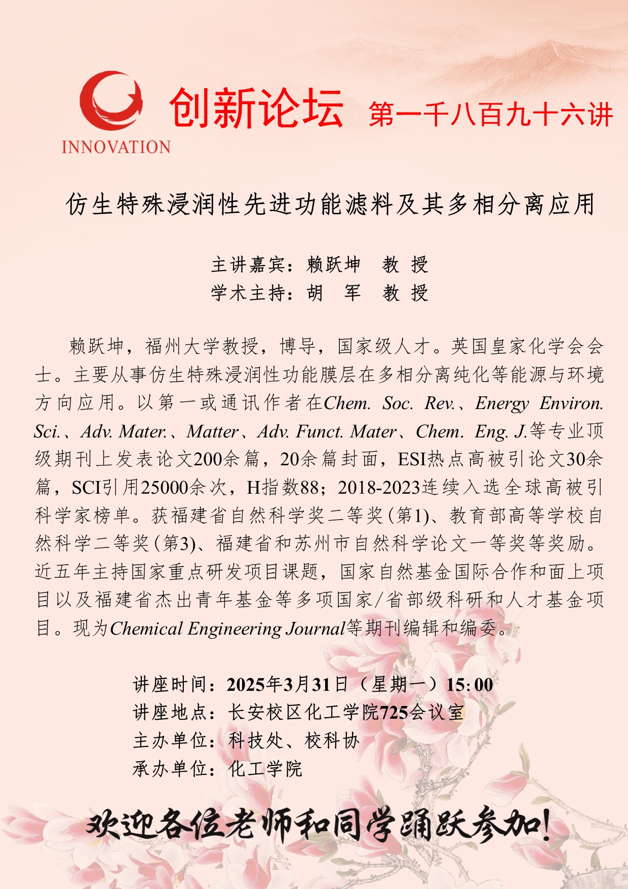 赖跃坤 教授 古天乐代言太阳集团城网址创新论坛第一千八百九十六讲:仿生特殊浸润性先进功能滤料及其多相分离应用 讲座时间 2025年3月31日(星期一)15:00 讲座地点 长安校区化工学院725会议室 讲座人介绍 赖跃坤 教授 讲座内容