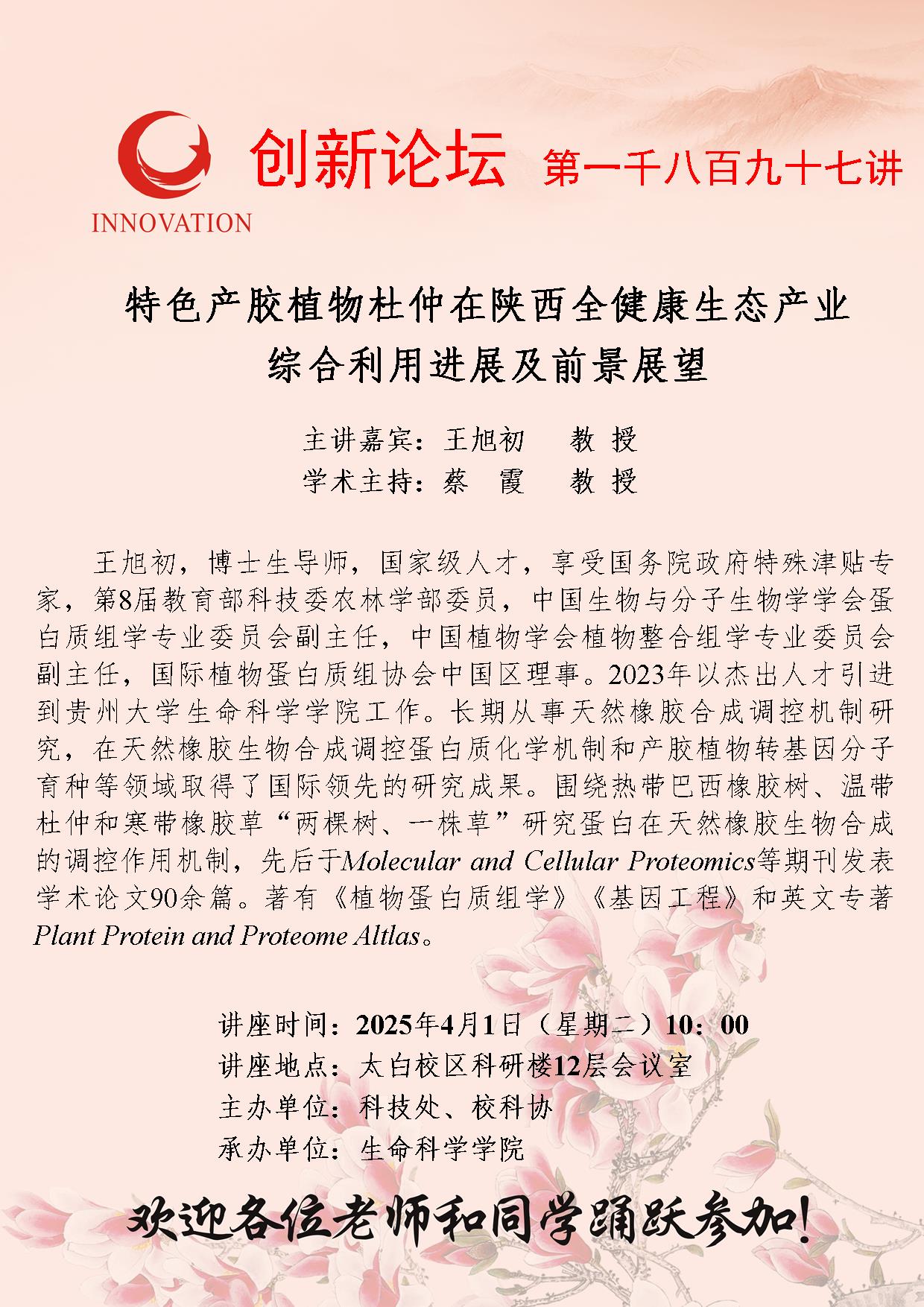 王旭初 教授 古天乐代言太阳集团城网址创新论坛第一千八百九十七讲:特色产胶植物杜仲在陕西全健康生态产业综合利用进展及前景展望 讲座时间 2025年4月1日(星期二)10:00 讲座地点 太白校区科研楼12层会议室 讲座人介绍 王旭初 教授 讲座内容