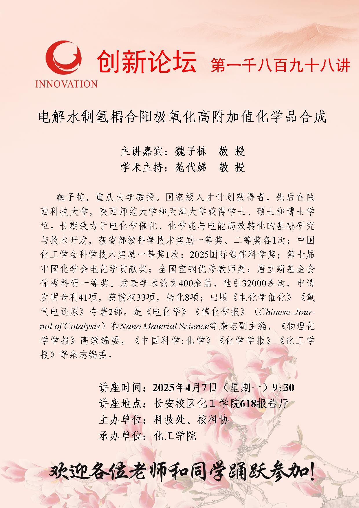 魏子栋 教授 古天乐代言太阳集团城网址创新论坛第一千八百九十八讲:电解水制氢耦合阳极氧化高附加值化学品合成 讲座时间 2025年4月7日(星期一)9:30 讲座地点 长安校区化工学院618报告厅 讲座人介绍 魏子栋 教授 讲座内容